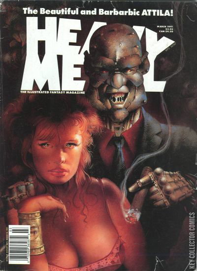 The Beautiful and Barbarbic ATTILA! Sirvent cover, Attila by Sequra & Ortiz, March, 1991, issue 131. Dubbed "The adult illustrated fantasy magazine," Heavy Metal also publishes tales of horror, science fiction, and adventure. This issue includes the following stories: Attila by Segura and Ortiz; Inkangaroous by Lou Stathis and Dan Steffan; L by Eric Drooker; Modern World by Peter Kuper; For a Couple of Lousy Apples by Miglelanxo Prado; Modern World by Peter Kuper; and The Cat at the Window by Rick Geary. Includes Rick Nemo art gallery. Cover art by Sirvent. Cover price $3.95.