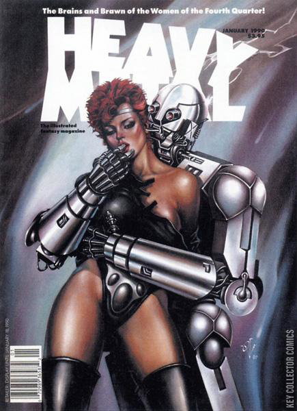 Vol. 13 No. 6 Ovi Hondru cover, January 1990, issue 124. Dubbed "The adult illustrated fantasy magazine," Heavy Metal also publishes tales of horror, science fiction, and adventure. This includes the following stories: The Fourth Quarter by Juan Gimenez; Linen's Lipstick by Miguel Angel Prado; 1881 by Rick Geary; Return to Sea by Laurent Theureau and Patrick Galliano; and The New Frontier by John Sablic and Michael Cherkas. Cover price $3.95.