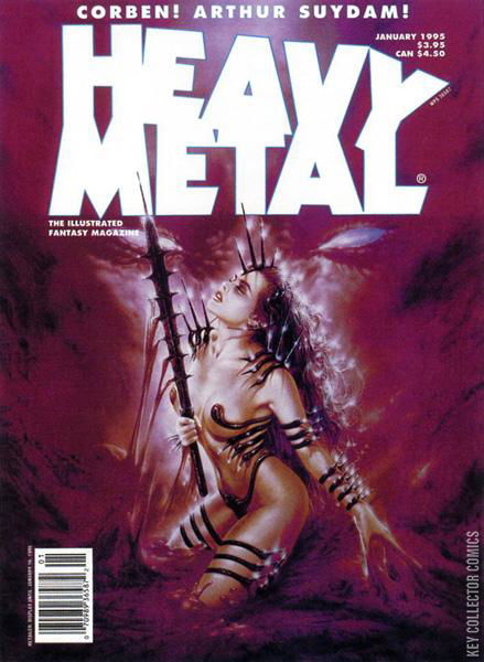 Vol. 18 No. 6 Royo cover, Corben, Suydam, January 1995, issue 154. Dubbed "The adult illustrated fantasy magazine," Heavy Metal also publishes tales of horror, science fiction, and adventure. This issue includes the following stories: The Inducement by Richard Corben; Teddy Bear by Gess; Crypt Copper by Gordon Rennie and Roger Langridge; Sgt. Kirby by Jerry Paris; Museum by Fernando de Felipe; Zone B: In a Place of the Mind by Josep M Bea; Merchandising by Das Pastoras and Prats; and Caveman by Tayyar Ozkan. Includes Arthur Suydam art gallery. Cover art by Royo. Cover price $3.95.