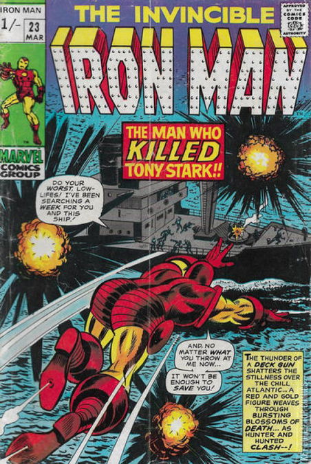 The Man Who Killed Tony Stark!Iron Man is relentlessly attacking the smuggling ship that had transported Titanium Man to America in the previous story arc. Titanium Man eventually killed Tony Stark’s girlfriend Janice Cord and a vengeful Iron Man leaves the ship completely destroyed then alerts the US Navy to capture the crew. Getting back to ground and still in his armour, Tony blames himself for being distracted by the Crimson Dynamo and not protecting Janice. All the while he is being watched through the sniper scopes of The Mercenary. The assassin for hire thinks how easy it would be for him to kill Iron Man right now, but his target is someone else.Tony decides he needs to get away from everything and clear his head. While driving away, he is taken by surprise when a hidden figure in his back seat holds a gun to his head. Cheryl Porter lowers her weapon and tells Tony she needs his help. Cheryl tells Tony it was she who informed him about the smuggling ship. Her husband Geoff was a sailor on the ship and she feared for his life if the police got involved so sought help from Iron Man. But when the ship’s Captain found out he hired an assassin to kill her. Tony swears to protect the well endowed Cheryl and takes her to a secluded lodge. Meanwhile The Mercenary listens to their conversation via a bug he planted.On the way to the lodge, Vincent Sandhurst attempts to assassinate Tony Stark but is beaten to near death by The Mercenary who wants the prize for himself. The assassin arrives at the lodge only to find Cheryl hidden in a protected shelter and Iron Man waiting for him. A fight begins and The Mercenary gains the upper hand by draining Iron Man’s armour of electricity. The hitman then disguises himself as Tony Stark to fool Cheryl into letting him inside the shelter. However as he enters, Sandhurst arrives and kills the man he thinks is Tony Stark, before falling to his death himself. Iron Man recovers and takes Cheryl away.