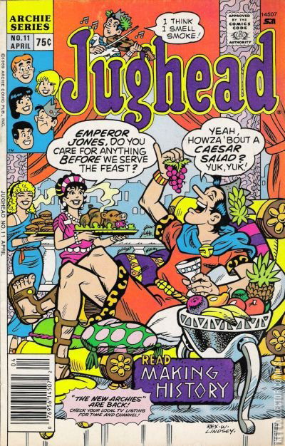 Cover art by Rex W. Lindsey. "Karma Comedy," script by Rod Ollerenshaw, pencils by Rex W. Lindsey, inks by Jon D'Agostino; Reggie sends the regular Archie writer on vacation so he can write a story to get even with Jughead. "Scared Happy: Sunkist Fun Fruits ad with Archie and His Friends. "Turn the Other Chick!" , script by Rod Ollerenshaw, pencils by Rex Lindsey, inks by Jon D'Agostino; To take her mind off Jughead, Ethel enters a cooking contest. "A Public Service Message from Archie Comics" public service announcement about AIDS awareness. "Jughead's Family Tree," script and art by Rod Ollerenshaw; Four examples of Jughead's ancestors and their unique accomplishments. "Invite Advice" half-page story; Mrs. Andrews tells Jughead to make himself at home so he starts eating all of the food in the house. Archie Club News. "Hamburger Topping!" activity page with Jughead. Statement of Ownership Average no. copies each issue during preceding 12 months, 154,596; Actual no. of copies of single issue published nearest to fi ling date, 156,997. Professor Jughead's Looney Laws; Some strange laws around the country; First law is about wrestlers making faces. "Making History," script by George Gladir, pencils by Rex W. Lindsey, inks by Jon D'Agostino; Previous incarnations of Archie and Jughead throughout history. "Cocoa Pebbles BMX Bike Race" cereal ad with The Flintstones Last 75-cent cover price