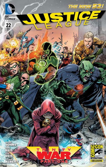 TRINITY WAR, PART ONE: THE DEATH CARD Madame Xanadu had not always done the right thing in her life. For years, she had used her powers in ways she is no longer proud of, until she met with the magician John Zatara, who had taught her that she could change her life around. Now, she keeps her shop, Hokus & Pokus Occult Curioso in Greenwich Village, waiting for those in distress to find her, through the magic she hides behind. From there, she helps those people onto a different path. Tonight, a woman comes to Xanadu on the advice of a friend, having struggled with a recurring nightmare in which she is burned to death in a fire by herself - an evil that lies within her that she is afraid of. Two nights previous, she had found a can of gasoline next to her bed, and has been too frightened to sleep since. Xanadu takes the woman's hands and sees the future, but it is not her future. She sees the aftermath of a great war; a war defined by the word Trinity. Ignoring the woman's terror, Xanadu looks to her cards to see who will be responsible for this Trinity War, and she sees Billy Batson - the ill-chosen hero known as Shazam. Meanwhile, in Philadelphia, Billy Batson insists that it is the right thing to spread Black Adam's ashes in the beleaguered region of Kahndaq, despite his friends' warnings that the government has issued warnings against any Americans travelling there. Even so, Billy insists that even bad guys deserve a proper burial. At Belle Reve Prison, Superman and Wonder Woman have just finished dealing with Despero, but the hassle has forced them to change their evening plans together. Diana has little faith that Despero will stay put, and notes that she does not have issues with villains constantly escaping and attacking because she deals with them properly. The comment unnerves Superman, who is opposed to killing. Diana responds that she would only do so if necessary, adding that her Lasso of Truth prevents any innocents from being wrongly punished. The pair are interrupted by the appearance of Pandora, who hopes that she had finally found the ones of purest heart who are capable of opening her box. Diana recognizes her, a being of Greek myth herself, and is apprehensive that the gods sent her. Pandora explains that she was not sent by the gods. She believes that it was the gods who manipulated her into opening the box in the first place, damning both herself and all of humanity by freeing the Seven Sins. Hopefully, someone pure of heart can help her forever eradicate that evil. Meanwhile, Steve Trevor is skeptical that Dr. Arthur Light is a good choice to recruit for the government-created Justice League of America, given that he is a scientist, not a soldier. From the JLA's headquarters in Washington, D.C., Trevor and Amanda Waller secretly monitor Arthur Light as he calls to his wife Kim to tell her of the powers that he came upon by accident, and the mission he was given; to use his power against Firestorm. Grumpily, Waller orders that the Martian Manhunter be sent to erase the information from Mrs. Light's mind, and intends to warn Light that if he speaks to her again, she will have the Martian erase him from her mind. On Rhode Island, the Justice League searches the ruins of their Watchtower, following the attack by Despero. Cyborg is disturbed that someone had managed to hack into the system to let Despero in. Meanwhile, someone else - possibly the same person - had stolen the Kryptonite Ring from the Batcave. Nearby, FireStorm and the The Atom sift through the remains of the trophy room in search of anything salvageable. Firestorm marvels at the Atom's having apparently managed to stop Despero all by herself. Unbeknownst to anyone else, Rhonda had been helped by the mysterious Martian Manhunter, who had sworn her to secrecy about his complicity. Ignoring Firestorm's praise, the Atom discovers a Justice League themed chess-set in the ruins, but notices that the Superman piece is missing. Superman, meanwhile, doubts that humans could possibly be evil merely because someone opened a magic box. Pandora promises that she saw it for herself, and Wonder Woman confirms the story. Pandora explains that she knows of someone who can undo what she did by opening the box and imprisoning the sins again. With that, she thrusts the box into Superman's hands, believing that if anyone can survive the touch of the box, it would be Superman. His contact with the object is painful, and Wonder Woman worries that it is doing something to him. Pandora realizes with horror that Superman is succumbing to the box's evil, indicating that he is more human than she realized. Hoping to stop him, Pandora fires her pistols at him - which actually seem to injure him - causing him to drop the box. It is only through Wonder Woman's intervention that a potentially fatal shot is deflected. By the time they recover, though, Pandora is gone. Bad news follows, as Batman warns of reports that someone in a cape has entered Kahndaq. He is aware that it must be Shazam, but he believes that the super-human is unaware that the Kahndaqi army is on his tail. Batman warns that Shazam's power is magical in nature, and so Superman suggests that they turn to Zatanna for help. The Atom, meanwhile, warns Steve Trevor of the Justice League's intention to enter Kahndaq in pursuit, and so Waller orders that the JLA - with Artur Light in tow - will be going to get the Justice League out. Steve warns that their team isn't ready for this kind of mission, but Waller sees it as too strong an opportunity to prove that the Justice League, without government support, is uncontrollable. The JLA themselves are on-side with Trevor, though they must follow their orders. Sighing, Trevor explains that this mission calls for diplomacy before action. In Kahndaq, Shazam prepares to lay Adam's remains to rest, only to be interrupted by military gunfire. Soon, a bullet strikes the urn in which he held the ashes, and his sentimental moment is ruined.