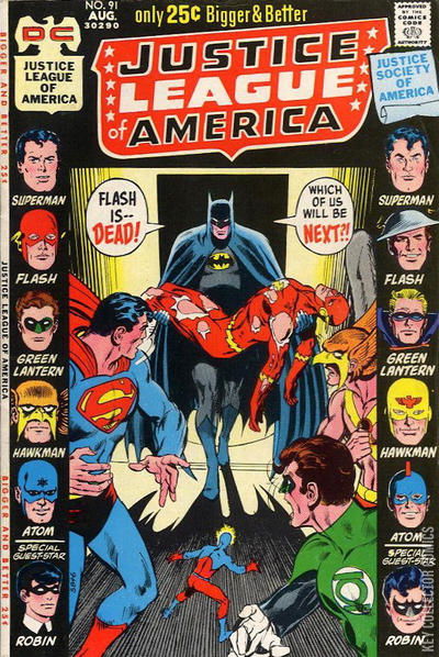 EARTH - THE MONSTER-MAKER! On a joy-ride between dimensions, an alien boy called A-Rym and his symbiotic pet, Teppy, are flung into the separate worlds of Earth-One and Earth-Two. They must be re-united, or both will die, but the environment of Earth changes both into rampaging, monstrous menaces. Flash has already been injured in an encounter with Teppy, while the Earth-Two Green Lantern falls prey to A-Rym, who takes his power ring, sensing that it can reunite him with his pet. Joined in the battle by the Robins of both Earths, the Justice League and Justice Society form two new teams to deal with the threats. Green Lantern joins the two Hawk-men and the two Robins against A-Rym, while Flash of Earth-Two teams with the two Supermen and the two Atoms against Teppy. While this second group successfully captures Teppy, on Earth-Two, Robin of Earth-One is injured in the struggle, and A-Rym finds an ally in the macabre Solomon Grundy. THE DAY THE WORLD MELTED This story is reprinted from Mystery in Space #6. THE HOUR HOURMAN DIED! This story is reprinted from Spectre #7.