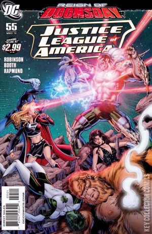 "Eclipso Rising Part 2 - Mayhem" The Rise of Eclipso continues! With the Spectre fallen and darkness spread throughout the DC Universe, no one is safe from Eclipso's control! Not any of DCs shadow-based heroes and villains. Not Alan Scott and the magical beings of the moon's Emerald City. Not even the World's Greatest Heroes! And when Eclipso's ultimate goal is revealed, they'll see that it's scale is even bigger than the DC Universe. One lone hero has the power to make sure all be well however...for he has hope. Introducing Blue Lantern Saint Walker to the Justice League of America! In the remains of New Krypton, Doomsday tears through Batman, Supergirl and Alpha Lantern Boodikka in his search for Cyborg Superman as "Reign of Doomsday" rampages on!