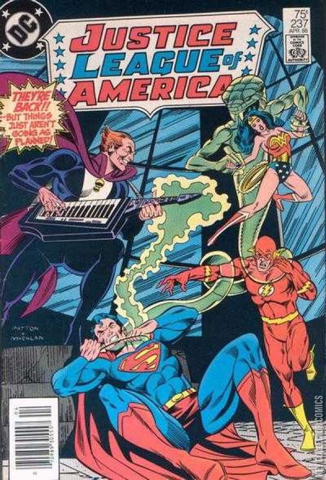LEST AULD ACQUAINTANCE BE FORGOT... Superman, Wonder Woman, and the Flash travel to the Justice League satellite and find it destroyed. They are puzzled by the destruction in the few hours they had been gone, especially when Superman finds a Soviet spy satellite loaded with explosives nearby, so the trio goes to Russia for answers. Their proximity to the satellite has triggered an alarm in the new Justice League headquarters, and the new team tracks their former teammates. The Russian Air Force greets the trio's invasion of their air space with missiles, then fighters, but the heroes land without injury. They are surrounded by troops and met by a general and a man possessing the keyboard of their old foe Anton Allegro. His melodies paralyze them, and they are captured by General Anton Gorki, who wishes to use them as a bargaining chip to restore himself to commander of the Red Army, as well as being named Party Chairman. Meanwhile, the new Justice League has sent Steel, Elongated Man, and Dale Gunn to use Hank Heywood's CIA contacts to figure out why the three heroes have gone to the Soviet Union, but Heywood is more intent on pointing out the police records of Vibe and Gypsy, along with Ralph Dibny's alleged shady past, to the point that his grandson throws him through a window. Only Elongated Man's intervention prevents further battling, and Steel and Elongated Man leave without getting the information they wanted. As the three Justice League members lie paralyzed in Gorki's winter estate, an inmate reveals that Anton Allegro has escaped his asylum in the U.S., and has returned to the land of his parents' births. However, he has fallen into the asylum of the very mad general who now intends to execute one of the three heroes to penalize his country for refusing his demands, thus risking a war between the U.S. and the U.S.S.R.