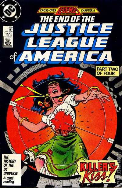 Legends Chapter 9; The End of the Justice League of America, Part 2 of 4. "Homecoming!" Written by J.M. DeMatteis, with art by Luke McDonnell and Bill Wray. Characters: Vibe; Martian Manhunter [J'onn J'onzz]; Vixen; Steel; Gypsy (all as the Justice League of America/JLA); Professor Ivo (villain); Amazo (flashback); Superman [Earth-1] (flashback); Flash [Barry Allen] (flashback); Wonder Woman [Earth-1] (flashback). Issue bannered as "Legends Cross-Over Chapter 9."