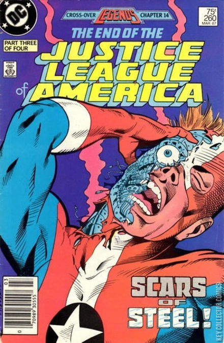 Legends Chapter 14; The End of the Justice League of America, Part 3 of 4. Scars of Steel in "Flesh!" Written by J.M. DeMatteis, with art by Luke McDonnell and Steve Montano. Characters: Martian Manhunter [J'onn J'onzz]; Gypsy; Steel; Vixen (all as the Justice League of America/JLA); Professor Ivo (villain); Commander Steel (cameo). Legends cross-over chapter 14