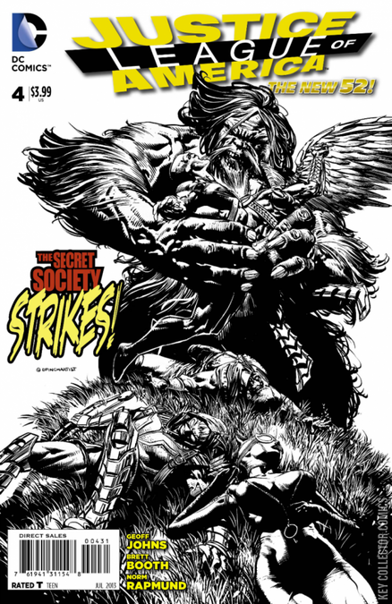 WORLD'S MOST DANGEROUS CHAPTER FOUR - THE GOOD, THE BAD, AND THE SHAGGY Despite having promised his wife that these late night calls would stop, Arthur Light is wakened from his sleep by a call from Amanda Waller, who requires that he come in to work at A.R.G.U.S. Elsewhere, Catwoman has got herself an audience with the so-called Secret Society. Unfortunately, that entails being strapped to a chair in a bare room with concrete walls and no windows. Despite the plan to sit tight, and see what happens, she impulsively escapes from the straps and picks the lock on the door. Meanwhile, Steve Trevor and Waller have Dr. Light in to examine what appears to be a modified silver dollar inscribed with Latin phrases. On one side, it says "Let them hate as long as they fear," while on the other, it says "Forever Evil." Despite the cryptic motto, the object also appears to be some kind of communication device. Oliver Queen had seen Multiplex using it to talk to somebody. The object appears to be emitting a frequency for which there must have been a loophole, given that all other communications in the Kielder Forest were blocked. So, it must be a special communication device for the Society. However, the frequency may be biological or alien. At the JLA Hangar, Steve introduces the team to their new mode of transportation: the Invisible Jet. Once in the air, Waller relays that the frequency - and Catwoman - have been isolated in the Superior National Forest in Minnesota. Meanwhile, Stargirl is slated to give a battery of radio interviews as PR for the team - but she has chosen instead to stow away on the jet. In the national park, the JLA follows Catwoman's signal to the Society's mansion, which has somehow transported itself from England to Minnesota. Katana slices the door in half, and they all creep inside, with Stargirl following secretly. Vibe senses some extradimensional technology within the mansion, and they soon discover that it is more of the robotic Justice League that Professor Ivo designed. Meanwhile, Catwoman is interrupted in her explorations by Ivo himself, who is badly disfigured after he allowed S.T.A.R. Labs to think he died in an explosion. He will not tell her what he is currently working on, simply inviting her to meet their leader in the banquet hall. Rather than go with him, she knocks him unconscious, only to be caught moments later by Copperhead, and strangled into unconsciousness. The JLA, meanwhile, is suddenly attacked by the monstrous Shaggy Man, and they do not fare very well. Catwoman wakes strapped to the chair again, with a pale man clad in purple standing in front of her. He demands to know what she and her friends are doing there. He is aware of the JLA's encounter with the Shaggyman, and Dr. Light's attempts to access their communication systems. He warns that Light is about to receive an unpleasant call. As Dr. Light begins hearing a voice from the object, the pale man puts a gun to Catwoman's head, and orders her to start talking. Instead, she warns that if he kills her, the Batman will stop at nothing to find them. This, however, is exactly what the society wants. Dr. Light is suddenly knocked back by a burst of light, just as the pale man pulls the trigger, leaving Catwoman dead on the floor of the concrete room. TRIAL BY FIRE In combat with the Shaggy Man, Martian Manhunter is faced with his greatest fear - fire. Though his body is invulnerable, even to flames, his psyche is not at all. However, it was not always that way. Long ago, he had completed the Test of State - killing the most deadly beast on Phobos - and was set to return to Mars as the leader of his people. The old leader was dying, but his memories would be recorded and collected; passed on to the next leader. The people of Mars were all connected by their telepathic collective consciousness, but in order to perform The Test of State, J'onn had had to disconnect himself from it, temporarily. Unfortunately, upon his return to Mars, he found that he would never feel that connection again. In his absence, Mars had been burned and destroyed, with no lives spared. Though the memories of his predecessor would not be passed on to him, one alien concept was imprinted upon him that day: Man. He had never heard the word before, but he knew that man was responsible. The reason that fire hurts J'onn now is guilt. He feels that he should not have survived where all of his people had died. He should never have been the last Martian.