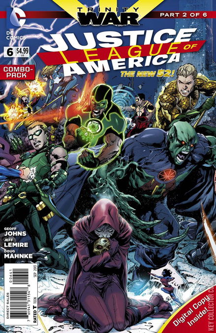 TRINITY WAR, PART TWO For centuries, The Question has been seeking answers to questions. Foremost in his mind is the question of who he really is. He believes that if, one day, he answers enough questions, the answer to that question will be given to him. Until then, though, he is the man without a face. For now, though, he must answer a different question: "Who is the evil behind the evil?" Meanwhile, in Kahndaq, the Justice League of America stands in disbelief having just watched as Superman killed Dr. Light, their newest member. Hurriedly, Steve Trevor warns that the need to neutralize the rest of the Justice League, then deal with Superman. Unfortunately, neither side is particularly enamored with the idea of fighting the other, but they are compelled to do so, whether in self-defenses or in service of their country. As the battle becomes more heated, Superman himself struggles to keep his eyes shut to prevent further bursts of uncontrollable heat-vision, begging everyone to stop fighting and just lock him up. Finally, everyone stands around him silently, until Trevor decides that it's time to bring Superman in. Later, Trevor returns to A.R.G.U.S. to report back to Director Waller, who still doubts that Superman would kill a man, despite the fact that her entire team saw it. Still, she sees Superman's loss of control as an opportunity for the JLA. If Superman cannot be controlled, then the Justice League cannot be controlled, and it will be up to the JLA to take them all down. Warily, Steve worries that Waller might have orchestrated this scenario. In the A.R.G.U.S. medical wing, both teams are receiving required medical attention, and nobody really believes that Superman killed Dr. Light on purpose. Meanwhile, Shazam is eager to leave, given that he is a member of neither league. The Atom's guilt at her betrayal fills her with a need to come clean about what she did, but Batman is too busy to listen. Amanda Waller offers her ear, after she has a word with Firestorm. Taking him aside, she asks him if he can make Kryptonite. Meanwhile, Steve leads Wonder Woman to see Superman, explaining that Waller wants to keep him there while they run tests. Diana is not impressed with Steve's involvement with the other Justice League. She hoped that if they were still friends, he might have told her about it, rather than revealing the JLA through a press conference. She notes that a man is dead because Steve and his government could not trust the Justice League enough to talk to them. And Superman will never forgive himself for that mistake. Batman stands watch over Superman, who has been locked down in a super-power suppressing device. Superman hasn't stopped coughing since they arrived, and Batman is unsure whether it is a physical or psychological ailment. Clark begs to know who he killed. Bruce explains that Dr. Light was a scientist at A.R.G.U.S. until an accident gave him the ability to manipulate energy. At the time of their encounter, Light had not fully learned to control his abilities, and because of Superman's physiological dependency on solar energy, their proximity could have accidentally triggered a release of that energy. The Martian Manhunter and Cyborg have been allowed to preside over the autopsy together, to see what they can learn about the incident. Clark is more concerned about whether Arthur Light had a family. Reluctantly, Bruce admits that he had a wife and three daughters. Clark bites his lip. Arriving, Diana angrily demands to know why Bruce would tell him something that would hurt him like that. She ignores his non-response and explains that what happened had nothing to do with Dr. Light and everything to do with the encounter they had with Pandora's Box earlier. Bruce doesn't believe in the myth of Pandora's Box, believing that man chooses to be evil, and insists that they pursue this all scientifically. Diana is sure that she is right, and decides to pursue her angle only. Wonder Woman seeks out her cousin Hephaestus, the blacksmith god, and wrapping her lasso 'round his neck, she demands to know just what Pandora's box really is, and what it does. Despite his having been a friend to her in the past, Diana insists that right now, she needs the truth, and she needs it immediately. She knows he forged the box. He responds, however, under the influence of the lasso, that he did not forge it - and that it is not what she thinks it is. He explains that there are other magics in the world, beyond those of the Gods of Olympus. When they had tried to control the box, they had used Pandora to open it, because they were scared of it. As she leaves, he warns her that she would do best to destroy the box, rather than trying to unravel its mysteries. Finding not much help from either Gods or science, Diana turns to magic itself; she turns to the Justice League Dark. At A.R.G.U.S. Headquarters, Superman is freed of his restraints by a man who resembles Steve Trevor. Superman protests that it is not safe to free him, but the man responds that he knows Superman is not a killer, and reveals that he is not Steve Trevor. He is the Question, and he hopes to help Superman find out who really killed Dr. Light.
