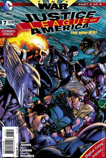 TRINITY WA R, PART FOUR Lex Luthor's lawyers are pleased to announce that they may be able to get him out of prison, and put him back in charge of Lexcorp, but Lex is far more concerned with the headline on his newspaper - Superman has been accused of manslaughter. And, despite his feelings about the alien, he knows Superman was set up for a fall. While he is jealous, he is also curious. Why did whomever did this do it? He is surprised, suddenly, by a visit from Pandora, who explains that she is on a mission to save the world from the evil she unleashed on it - and in order to do that, she needs someone dark of heart to open her box, and she thinks Lex may be that man. Meanwhile, in the morgue at A.R.G.U.S., Plastique infiltrates the room where Dr. Light's body is being kept, using Superman's escape as a distraction. At her employer's command, she places a device on the body, and escapes unnoticed. In Pittsburgh, Doctor Psycho has captured and restrained a group of innocent people - though he is not so naïve as to think that anyone is totally innocent. He intends to exploit the evil thoughts within them, and make them do evil acts on each other. He is displeased to discover, though, that the Martian Manhunter has found him before he can enact his plan. In fact, the Martian has brought a whole team of super-heroes with him. Though the hostages are rigged with explosives, Firestorm manages to transmute the C-4 so that it is inert. Unfortunately, Psycho manages to escape by tricking Green Arrow into thinking that Cyborg is Doctor Psycho, and using the explosion that his arrow causes as a distraction. Using Superman as bait, though, Martian Manhunter manages to get his hands on Doctor Psycho, and enter his mind. Elsewhere, Steve Trevor and what remains of Batman's team are trying to get back inside the House of Mystery after the Phantom Stranger took the other half of the team inside, and left them locked out. The Flash wonders why the Stranger would have taken Batman, Katana, and Deadman with him and left the others behind. Catwoman suggests that perhaps the House itself can tell them, given that Constantine had said it was alive. She asks the House to open the door, and to everyone's great annoyance, it works. Working from that good-fortune, Catwoman approaches a window in the room they find, and asks where to find the Phantom Stranger. Soon, his image appears in the glass, and he speaks to them. He explains that he and the others attempted to interrogate Dr. Light in the after-life, but found that he knew nothing. Unfortunately, he made an error, and while he may not be able to return, he does send the remains of their team back through the mirror to them. Martian Manhunter demands to know whether Doctor Psycho was in Kahndaq when Dr. Light was killed. Struggling to defy the alien, Psycho admits that he was sent there by the Secret Society, however, his orders never came. He now knows that he was sent to be used as a scapegoat for what happened. He hadn't even known that Superman was in that country. When J'onn admits that the man is telling the truth, Superman begins to wonder if maybe Wonder Woman was right that it was Pandora's Box that influenced him. However, they all now have a lead on this Secret Society. Sadly, The Atom admits that they would already know about the Society if she had told them the truth. She was a mole from the JLA, which was created as a fail-safe against the Justice League. Despite the friendships she formed there, she was working for Amanda Waller the whole time. Even so, she doubts that Waller could be behind everything that happened. Regardless, Superman orders that they return to question her. Pandora presents the box to Luthor, who agrees with curiosity to lay his hand on it. Before he can, however, Pandora is yanked back by Wonder Woman's Lasso. In her struggle to get the box away from Pandora, the Amazon touches it, and the box activates. At the House of Mystery, the Phantom Stranger warns that Madame Xanadu is still alive, and must be found. She knows the truth behind Pandora's box, and what it can really do. Before he can explain what the box really is, though, he fades from view. Just as Superman and company confront Waller at A.R.G.U.S., the Secret Society detonates the device on Dr. Light's corpse, and the resulting explosion knocks everyone back. Wonder Woman, meanwhile, has Pandora's Box - but it has her.