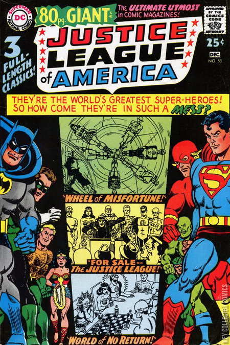 THE WORLD OF NO RETURN! This story is reprinted from Justice League of America #1. THE WHEEL OF MISFORTUNE! This story is reprinted from Justice League of America #6. FOR SALE - THE JUSTICE LEAGUE! This story is reprinted from Justice League of America #8.