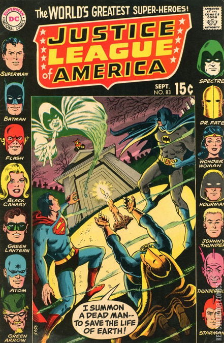 WHERE VALOR FAILS...WILL MAGIC TRIUMPH? An alien being known as Creator² is attempting to merge Earth-One and Earth-Two into a single universe using the Red Tornado as a pawn to do so. As the Justice Society of Earth-Two tries to figure out what happened to their comrades, the Justice League of Earth-One have learned of the crisis prompting their teammate Black Canary to believe that she is the cause since she crossed over from Earth-Two. The alien attackers seeking to incapacitate the entire Justice Society send more devices to trip up the heroes. While on Earth-One, the JLA decide to investigate things further sending Green Lantern back out into the void between universes to learn the truth. Back on Earth-One, Hawkman is dispatched to maintain order when suddenly everyone's Earth-Two counterparts begin materializing on Earth-One once more. After saving an old lady, Hawkman is also struck down because his Earth-Two counterpart is incapacitated by the alien devices. Just as Green Lantern of Earth-One finds the source of the disruption, the Red Tornado, he is also immobilized because his Earth-Two counterpart is trapped in a wooden cage by his attackers. Back on Earth-One, the Atom, Green Arrow and Black Canary await to hear back from Green Lantern. The Black Canary continues to believe that she is the cause and contemplates committing suicide by the JLA Satellite's teleporter, hoping that would save the universe. While on Earth-Two, Johnny Thunder, the Thunderbolt, and Dr. Fate manage to fight off the alien devices. Fate decides it's time to call in the Spectre for assistance and the trio teleport to the graveyard where the Spectre dwells. The apparition agrees to help the remaining JSA members and the foursome travel to the dimensional void to see what the source of the problem is. There they find Earth-One's Green Lantern and the Red Tornado. While the Spectre stretches his body and acts as a barrier between the two realities, Dr. Fate, Johnny Thunder and the Thunderbolt are teleported to Creator²'s ship where they fight the insane alien. During the fight, the Thunderbolt destroys Creator2's devices, stopping the process and freeing the Red Tornado. With Creator²'s ship also destroyed, the two Earth's return to their original position however the Spectre is seemingly slain in the process. Back on Earth-One the JLA realize the crisis is over which brings both Green Arrow and the Black Canary great joy. With the danger passed they also find that Batman, Superman, Flash and Hawkman have revived. When Green Lantern returns to Earth-One to brief the heroes on what happened, they all mourn the passing of the Spectre, however Green Arrow doesn't think it is the last they've seen of him.