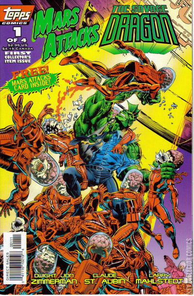On Mars, a temporal portal opens and the Colleen Mackay of the first timeline where Mars attacked Earth arrives with her master. She kills her master’s counterpart for this world just before the invasion of Earth begins. Earth suffers huge losses over the next few days and the city of Chicago only really has Dragon protecting it currently. Martians have been killed by the dozens but more swarm all over the city and Howard Niseman leads a SWAT team into battle. When the alien soldiers route their opponents, they move in to wipe them out, only to be killed themselves by the freak police officer. Dragon is spotted by high-ranking officers who believe him to be Agent Draii-ghnn, a spy who was genetically-altered to serve on Earth and gather information, while retaining no memories of his past. The claims are dismissed by the hero, who battles through the army and forces a flying saucer to flee before being completely destroyed. Vanguard is then contacted to teleport his ally to Mars so that he can take the fight to the Martians, but the superpowered policeman is abducted from his friend’s vessel and is taken prisoner… This comic originally came with a trading card inside.