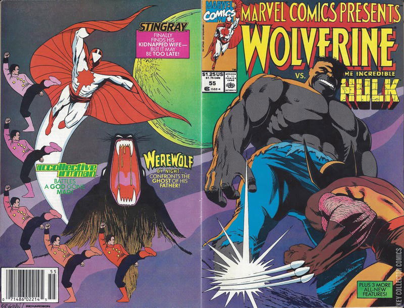 This issue features four stories."On the Road" starring Wolverine and the Hulk. "Part 2: With Friends Like These...""Children of the Beast" starring the Werewolf. "Part 2: The Gathering Storm" - As Jack Russell paints a pentagram and mystic symbols on the floor, he recalls his trip earlier that day to Zontar's shop. At the establishment specializing in magical artifacts, he traded a bag of werewolf fur to Zontar in exchange for a scroll containing a necromantic spell. While Jack prepares his ritual, Silver Dagger follows his trail, intimidating Zontar into giving him Jack's location. He leaves, and a leather-clad biker chick kills Zontar, then steals the werewolf fur.Soon, Jack conjures the spirit of his father Gregor Russoff. The apparition tells Jack he can't end his curse, so he must find a balance between the man and the wolf. As he fades, he offers a warning about "the grandchildren". As Jack stands in the remnants of his mystic symbols, Silver Dagger bursts in through his door."Family Matters!" starring Stingray. "Chapter Three: Pursuit!""The Sons of Mary Tao-Yu" starring Collective Man