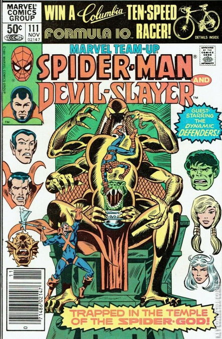 OF SPIDERS AND SERPENTS! While out on patrol, Spider-Man comes across some jewel thieves and gets the drop on them. Easily dispatching them, Spider-Man is about to leave when he suddenly feels like his stomach is on fire. Surrounded in a swirl of smoke he is surprised to find that his Uncle Ben is standing before him. Ben tells Spidey that he has died and that he will be led to the afterlife. However, before Spider-Man can go with a man who appears to be his Uncle, Devil-Slayer appears and strikes him dead. Spider-Man is about to attack Devil-Slayer until it's pointed out that his "Uncle Ben" is really a serpent like creature. Spider-Man then aids Devil-Slayer in fighting off the other "dead souls" until they retreat. Teleporting Spider-Man to his apartment, Devil-Slayer has him read off a card that has the magic word "Ka nama kaa lajerama" and he explains it is the one phrase that the Serpent Men can never say, and Spidey's ability to recite the words prove that he is really Spider-Man and not a serpent man impostor. Devil-Slayer explains that these Serpent Men are an ancient race of animal-people that existed centuries ago who battled the ancient barbarian Kull. As Spider-Man's spider sense continues to go wild, Devil-Slayer explains that a cult of Serpent Men still exists today and that they seek to use Spider-Man as their pawn to take over the world. When Spider-Man questions him as to why his spider-sense is going while Devil-Slayer explains that it is humanities genetic memory of the Serpent Men calling out to Spider-Man to defend himself. He goes on to explain that the Serpent Men seek to kill Spider-Man because of a prophecy that states that they would be defeated by a spider man. In order to complete their ritual, they would require a sacrifice and as such had captured the Defenders, prompting Devil-Slayer to seek Spider-Man out. Needing to obtain an ancient lizard statue, Devil-Slayer teleports himself and Spider-Man to China, where they begin seeking out the Temple of the Spider. Spider-Man becomes suspicious of Devil-Slayer when he is heavy handed with an old villager to get the location of the temple. There when they are attacked by the Spider-People, Spider-Man is further disturbed when he witnesses Devil-Slayer's savage behavior when fighting off the creature, making him suspicious of his would-be partner. None the less, Spider-Man jumps over a pit to a statue of Omm where he collects the statue. With the statue in their possession, Devil-Slayer teleports them back to the sewers of New York. There they come across what appears to be the Defenders, who claim they had defeated the Serpent Men. Spider-Man is asked to hand over the statue to Dr. Strange, finally deciding to heed the warnings from his spider-sense, Spider-Man recites the phrase "Ka nama kaa lajerama", revealing the "Defenders" (including "Devil-Slayer") to be Serpent Men in disguise. Spider-Man then realizes that he had been duped into retrieving the statue all along. Seeing the Defenders held in status in a device above them, Spider-Man tries to fight off the army of the Serpent Men. Finding himself outnumbered and realizing they seek to claim the statue, Spider-Man smashes it on the floor. A liquid issues fourth that burns all the Serpent Men in proximity. As they curse him for ruining their one hope of taking over the world again, the remaining Serpent Men charge at the wall-crawler. Although he is bum-rushed, Spider-Man manages to make a web ball and use it to smash the device keeping the Defenders captive. The Defenders then make short work of the Serpent Men, Dr. Strange and Clea banishing them off to limbo and then freeing their human slaves from their control. With the battle over, Devil-Slayer and the Hulk commend Spider-Man on a job well done when suddenly Spider-Man collapses. Awakening in Dr. Strange's Sanctum, Spider-Man is told that during the fight he was bitten by one of the Serpent Men, and if they do not act quickly he will die before the day is through.