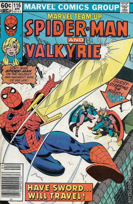 BETWEEN SWORD AND HAMMER! Valkyrie is out on patrol across the city when she spots a young couple being attacked by a gang of muggers. She swoops into action and her superior strength scares the thugs away before they can cause any harm. During the fight the mystical vibrations of her sword Dragon Fang attract the attention of the combined energy form of Meru the Mind-Bender and Dalia the Shape-Changer, aliens who previously battled both Spider-Man and Thor and seek to get revenge. Their energy form is attracted to Val's sword and transfer their essence into it, allowing them to take possession of Valkyrie's body. With Val under their control, the two aliens send her off to seek out Spider-Man and Thor to get revenge against them. At his Soho apartment, Peter Parker finds it increasingly difficult to focus on his studies and is hard on himself for his troubles being able to make it through school. Deciding to go out web-slinging to clear his mind, Peter changes into Spider-Man and swings off into the city. In his travels, he is found by Valkyrie who attacks him. Not understanding why he is being attacked, Spider-Man takes not that Valkyrie wavers when she throws her sword at him and misses, and then resumes her homicidal attack on him when she grabs her sword again. Realizing that she has been possessed, Spider-Man flees toward Dr. Strange's Sanctum Sanctorum in the hope of getting the aid of Dr. Strange. However, when he arrives there he is told by Wong that the Doctor is not present and is forced to flee again when Valkyrie catches up to him. Their chase attracts the attention of the media, who's news report airs on live television. Seeing the news coverage, Dr. Donald Blake recognizes Valkyrie as a woman his alter-ego Thor loves. He grabs his walking stick and uses it to transform into Thor and flies into action. Thinking that Spider-Man had attacked Valkyrie, and not the other way around, Thor attacks the Wall-Crawler until he realizes his mistake. As the two battle the possessed Valkyrie, her sword is once more knocked out of her hand freeing her from the aliens controls. As Thor and Valkyrie reunite, Spider-Man grabs the sword which attempts to fly off into space in order to kill Spider-Man. Using his superior strength, Spider-Man manages to redirect the sword back to the rooftop they were fighting off. Thor stops ogling Valkyrie long enough to smash Dragon Fang with his hammer, setting loose the Meru/Dalia energy being. Seeing their true threat for the first time, Thor uses his hammer to open a space warp to banish them through, ending their threat. With the battle over, Thor offers to repair Dragon Fang for Valkyrie and the two ride off on Aragon leaving Spider-Man alone to sort out what exactly happened. Without any sort of conclusion to be drawn from the battle, Spider-Man decides to return back to his apartment and work on his term paper again.