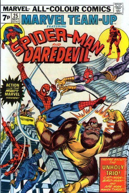 THREE INTO TWO WON'T GO! Spotting the Cat-Man stalking through the streets with a brief case, Spider-Man suspects that he is involved in a crime and tries to apprehend him. This causes Daredevil to get involved and come to blows with Spider-Man, allowing Cat-Man to escape. After realizing that his quarry had escaped, Daredevil stops the fight and explains to Spider-Man that Gail Callan -- the daughter of a rich industrialist -- was kidnapped earlier and that a ransom was handed over to Cat-Man (By Matt Murdock, Daredevil's civilian identity) and that Daredevil hopped to track the Cat-Man back to his hideout. Finding clues at the scene of the fight, Daredevil and Spider-Man track Cat-Man and his comrades in the Unholy Three in a shack just outside of Coney Island. Fighting the crooks across the amusement park grounds, they are eventually defeated and Gail is rescued. After, Spider-Man leaves Daredevil, Gail, and the defeated Unholy Three for the police.