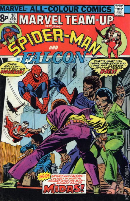 ALL THAT GLITTERS IS NOT GOLD! After a patrol, Peter Parker is changing out of his Spider-Man costume when he hears a scream from the streets below. Dutifully putting his mask back on, Peter spots his neighbor, Glory Grant being attacked by a group of men. Spider-Man gets between Glory and her attackers. Worried about having another false murder accusation lobbed against him, the wall-crawler pulls his punches on these thugs, even though they are coming at him at full force. Dodging a bullet, Spider-Man knocks out the attackers, with some assistance from Glory Grant. Now that Glory is safe, she asks Spider-Man to do her a favor and carry her attackers up to her apartment. The web-slinger complies to this strange request, and when he asks why he learns that one of these thugs is her cousin, Ramon. As she starts telling him that this is a family affair that she must deal with alone, Ramon suddenly wakes up and tries to attack them again. Noticing the youth is in a trance, Spider-Man wraps him up in webbing to stop him from hurting anyone. Suddenly, Ramon snaps out of it and tells them what happened to him. He explains that he and his friends went to a local nightclub where they were grabbed and drugged by some goons. They were then taken into the back of the establishment where a man in a gold suit sprayed them with something, and that was the last thing he remembered. Glory heard about this golden man, and how there were rumors about him wanting to wipe out African-Americans. Hearing this, Spider-Man is furious and decides to deal with this mystery foe and swings off. With Spider-Man gone, Glory places a call to the office of Sam Wilson in Harlem. Hoping it's Captain America, Wilson instead learns that it is from Glory Grant. After she tells Sam everything she knows, Wilson changes into the Falcon and goes out to investigate this new lead. The two heroes descend on the nightclub, unaware of each other until they both come crashing in through the main entrence. Their foe, a golden garbed man named Midas, orders his men to kill them. While Spider-Man webs up on half of the shooters, the Falcon tangles up the rest in a massive show curtain. During the confusion, Midas escapes, leaving the heroes to try and get answers from his minions. The Falcon tells Spider-Man to let him talk to the thugs as he speaks their language. Going outside, Spider-Man hears the sound of a ruckas inside as the Falcon beats the location of their employer out of them. When the Falcon emerges from the club, he tells Spider-Man that Midas is actually Harrison Merriwell. This comes to a shock to Spider-Man, as Merriwell is a well-known philanthropist. The pair travel to Merriwell's estate located in a suburb of Connecticuit and decide the best way to announce their presence is to come up and ring the doorbell. The butler is surprised to see two costumed individuals standing on the door, and invites them in anyway. No sooner are they inside, Spider-Man and the Falcon are struck from behind. When the pair awaken, they find themselvse shackled to the floor of a walkin freezer. There they are then confronted by Midas who tells them that he is leaving them to freeze to death, saying that they are as insane as his brother. As Midas turns to leave, Spider-Man fires some wedging the door, preventing it from closing all the way. As the temperature starts to drop, Spider-Man's webbing begins to expand, causing it to force the door open. The noise draws down people who are attending a party downstairs. Upstairs, they accuse Harrison's brother Malcolm of being Midas and trying to murder them. Malcom denies this but when the two heroes try to apprehend him, he fights back. Admitting that he did so to prevent his brother from squandering their fortune on the unfortunate. While trying to fight back, Malcolm is knocked out of a window when the Falcon literally pulls the rug out from under him, sending him into the river below the window. Harrison is not surprised that his brother was doing this, and fears that he is somehow responsible because he didn't pay enough attention to his brother. The Falcon and Spider-Man tell him that all Midas ever cared about was gold.