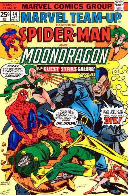 DEATH IN THE YEAR BEFORE YESTERDAY! In the present day, Moondragon has been plagued by dreams of Spider-Man, Vision, and the Scarlet Witch's situation in the year 1692, and soon finds herself pulled into that era by the Scarlet Witch's magic. There she finds that the Dark Rider has created a device that will drain the energies from Spider-Man, Vision, Scarlet Witch and Dr. Doom. Giving Cotton Mather a dagger which will help the process flow faster by killing each victim, Moondragon intervenes and blasts Dark Rider with a mental bolt. When Dark Rider tries to absorb Moondragon's power, she mind links with him and she learns his origins. The other heroes revive and arouse Dr. Doom, who counter-attacks Dark Rider. Taking a cue from Doom, the other heroes pile in and attack Dark Rider all at once. With the added power of Moondragon, Dark Rider is destroyed, and Cotton Mather is driven mad. With the threat over, Dr. Doom leaves allowing the heroes to use his time machine to return home. When Moondragon, Vision, and Scarlet Witch are about to travel back to the present, Spider-Man decides to stay a moment longer to try and stop the hanging of John Proctor and his followers. Unfortunately Spiderman finds that he has arrived too late, Proctor and his followers have already been hung for witchcraft.