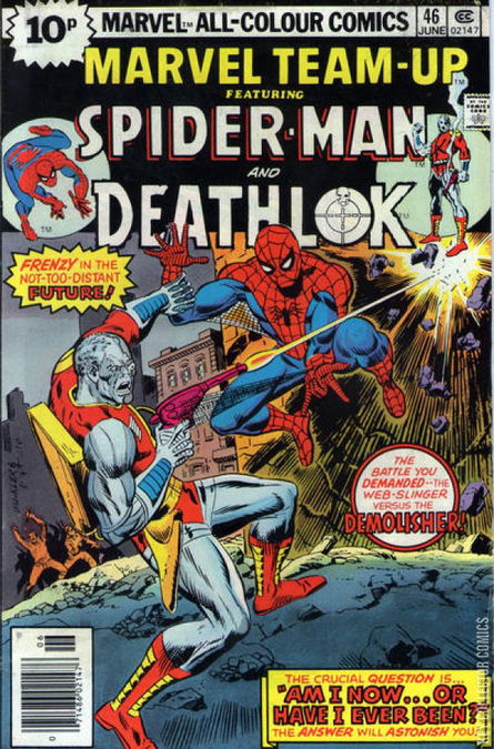 FUTURE SHOCK: PART II - ...AM I NOW OR HAVE I EVER BEEN? Still traveling through time and trying to get home, Spider-Man finds that he has traveled to another point in the future, but he does not know when this point is. He is shocked to discover Times Square in ruins and wonders what year it is. His thoughts are interrupted when he spots the cyborg known as Deathlok running past him. Seeking answers to his current situation, Spider-Man decides to follow after Deathlok to see what he can learn. Along the way, he spots Deathlok taking aim at a group of kids who are all carrying glowing cubes. He does not understand that these are cannibalistic thralls, and when Deathlok takes aim at them, Spider-Man leaps in to stop him. The cyborg's shot goes wild, alerting the Cubists to their position. Spider-Man tries to fight Deathlok until the Cubists gather around them and try to blast the pair. This forces Spider-Man to realize that the youths are a threat, and he helps Deathlok to send them fleeing. Asking Deathlok what is going on, he learns that he is some 15 years in the future from his own time. This revelation comes as a shock to the wall-crawler who wonders what has become of himself and his loved ones in this era. His attempts to get answers out of Deathlok yields nothing, as the cyborg tells him that he spent five years in Ryker's Body Bank and that there his memories were tampered with, the ones deemed useless having been purged. He then explains that the Cubists are a band of mutant cannibals that were hunting him as he was hunting them. Deathlok tells Spider-Man to help him carry the lone Cubist that was left behind as he believes it can help them find the rest of his group. As they continue down Times Square, Spider-Man continues to consider the implications of this future and hopes this might be an alternate reality as opposed to the true future of his world. As the pair continue their trek, they are unaware that they are being watched from above by two mercenaries named Strake and Grisson. The pair were sent here on orders from the Omni-Computer to eliminate Deathlok. Unsure what to make of Spider-Man, they suspect that he has also been targeted for destruction. Strake takes aim with his sniper rifle, but before he can squeeze off a shot, Spider-Man alerts Deathlok of the danger thanks to his Spider-Sense. Although the pair is able to avoid getting shot, the unconscious member of the Cubists is riddled with bullets. Furious at the senseless death, Spider-Man swings up and smashes through the billboard the two assassins are stationed from. He attacks Strake, demanding to know why he would senselessly slaughter a youth. His rage gets the better of him, as he fails to realize that Grisson is attempting to shoot him. However, Deathlok arrives and blasts the assassin with his laser. By this time, the Cubists have tracked down the pair, whom they attack with their cubes. Spider-Man and Deathlok make quick work of the Cubists, sending most of their numbers fleeing, leaving their costumed leader behind. Spider-Man is horrified when he unmasks the Cubists' leader to discover that it is a youth younger than he is. Hearing Deathlok's dismissive attitude toward the Cubists and his own obsession with getting revenge against Stryker sicken the wall-crawler. He decides that he has had enough and hopes that this horrible future is not his own. He returns to the Time-Platform in the hopes that he will finally return home.