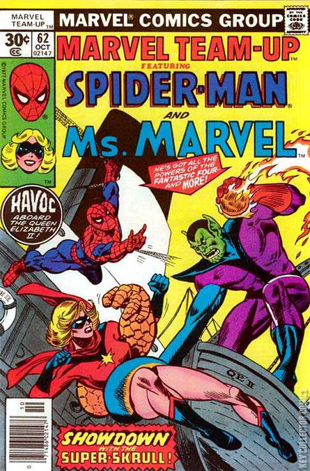 ALL THIS AND THE QE2 Spider-Man has failed to stop the Super Skrull from his rampage and now has to face the insanely powerful Skrull alone. However, as they fight on, Spider-Man notices that the Super Skrull's powers are weakening. When a power line burns up and snaps loose, the Super Skrull realizes that they electrical wires above are blocking the transmission beam from space that gives him his powers. Striking the electrical generator with a flame blast, the Super Skrull causes an explosion that knocks Spider-Man out and covers his escape. Pulling himself from out of the wreckage, Spider-Man learns from Jean DeWolff that the Super Skrull is attacking the cruise ship the Queen Elizabeth 2. This just happens to be the very ship that Carol Danvers is aboard, covering the story for Women Magazine. The Super Skrull has sought out a clay statue in the possession of antique dealer Josiah Rubin. Smashing the statue open, he finds a special Cavorite crystal inside that can power a star drive. Upon exiting Rubin's room, the Super Skrull is attacked by Ms. Marvel. Their fight takes them to the deck of the ship, where Ms. Marvel manages to not only get the upper hand against the Super Skrull but also to knock the jewel from his hands. As she recovers it, she recognizes it as being similar to one presently being studied by NASA. She is distracted long enough for the Super Skrull to attack her from behind, punching her so hard she goes flying toward the Statue of Liberty before she is rescued by Spider-Man, who snags her with a web line and pulls her back to the ship. Intrigued with how the Super Skrull was weakened due to the disruption of the power lines, Ms. Marvel sends Spider-Man to distract the Super Skrull by taunting their foe with the crystal. As Spider-Man keeps the Super Skrull occupied, Ms. Marvel wraps electrical wires around the top area of the ship to create a more concentrated interruption of the Skrull's powers and arranges with the ship captain to feed electricity through it. Spider-Man has meanwhile fled to the ship's bilges to get away from the Super Skrull. However, the alien manages to catch up to him. Spider-Man lures him into the parking level of the ship, where he traps the villain with Ms. Marvel and electrifies the grid she built outside the ship. Ms. Marvel battles the weakened alien and ultimately ends up throwing the crystal at the Super Skrull when he has her pinned with a car. It makes contact with the Super Skrull's body while she orders Spider-Man to turn off the jamming grid. The combination of the resumed energy flow and the crystal causes the Super Skrull to be teleported to some random place in space. Spider-Man breaks through the door to find that the Super Skrull is gone, but the crystal has remained behind. Picking it up, Ms. Marvel suddenly feels mesmerized by the crystal and it suddenly floods her mind with millions of images of her split personality of Carol Danvers and Ms. Marvel.