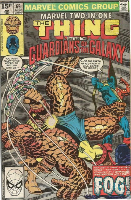 Ben is whipping up breakfast for Susan Richards and her son Franklin when Starhawk beams onto their breakfast table. It seems that Vance Astro has gone down to earth with the intent of meeting his younger self, and Starhawk fears that this will create a time disaster. He's come to Ben and the FF for help, and then almost immediately departs to go contact the Avengers. Unfortunately, he's a tad late, as we cut to the masked Vance Astro confronting his younger self. As the two walk, talking, a mysterious gray fog begins to creep up around them...Meanwhile, Ben and the Fantastic Four have detected a mysterious fog bank coming from upstate, and a mysterious energy source as well. They quickly head up to investigate, and while the others stay outside the creepy dark fog, Ben and Mr. Fantastic head in. Inevitably, Vance Astro scares his younger self, who runs off into the fog. Ben and the older Vance Astro come across each other in the fog, and after comparing stories and some physics notes, the two head off together in search of the younger Vance, the source of the fog, or both...