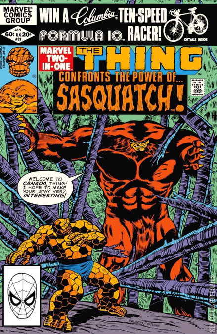 Giant-Man is unconscious on a table in Reed's lab, being examined. After a quick recap of the events of the last issue or two, and a quick showdown with an insensitive Human Torch, Ben returns to the lab, where Reed tells him not much can be done. He does suggest a Canadian scientist be consulted for help: Dr. Walter Langkowski, also known to us as Sasquatch. Ben jumps in a jet, and heads for Montreal. In Montreal, Ben finds out that Dr. Langkowski is on a field trip to Alberta (maybe he should have called ahead!), and so Ben heads for Alberta. Dr. Langkowski and Michael Twoyoungmen (Shaman) are on a pilgrimage in the mountains of Alberta, where Shaman has been finding some "grim portents" implying mystic troubles ahead. He soon finds a revealed cave with etchings from centuries past, and proceeds to investigate while Walter returns to camp for some equipment. While he's at camp, Ben's jet lands nearby, and Walter wonders if the Thing and the Fantastic Four could be the threat Shaman was expecting. Walter changes into Sasquatch, and goes to meet the Thing. The two are still in the process of sounding each other out when Shaman opens the wrong urn, releasing Ranark the Ravager, a native American spirit who'd been imprisoned for centuries. The release creates an earthquake, causing Sasquatch to lose his footing and fall towards Ben. Ben interprets this as an attack, and so Sasquatch and the Thing begin an epic battle in the forest while back in the cave a mostly helpless Shaman faces Ranark...