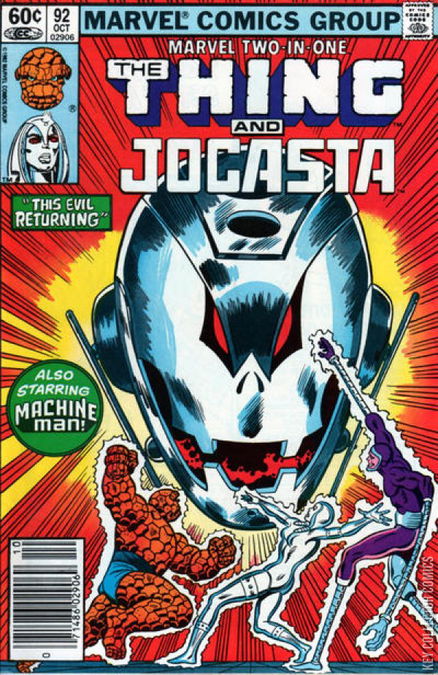 Bashful Benjy is in Egypt, where he's arranging for transportation back to New York after the events of last issue. After a few minor problems with too small metal detectors, a lack of identification, and some hijackers who picked the wrong plane, he's on his way home. Back in New York, Jocasta has come to the Baxter Building for help with her malfunctioning cybernetic senses. While Reed investigates the problem, Jocasta and Alicia strike up a friendship, and Jocasta is invited to Alicia's sculpture show the following day. Ben has arrived back in New York during all this, and the following day Reed sends him off to explain the destruction of the Pogo Plane to the insurance company. His insurance investigator is Aaron Stack (a.k.a. Machine Man). During Ben's meeting, Jocasta goes berserk at the sculpture show and races off. Ben gets beeped and goes off to help, telling Aaron he "has to go help a lady robot friend." Machine Man is intrigued for obvious reasons, and decides to investigate as well. Using his enhanced abilities, Machine Man is able to track Jocasta more quickly than Ben is, and MM finds her at an abandoned plant just after she finishes resurrecting... Ultron. Once he is resurrected, Ultron's hypnotic control over Jocasta ends, and she and Machine Man face off against Ultron. The Thing arrives outside the plant just in time to hear the fighting starting inside.