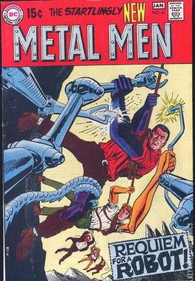 With Karnak the Killer's war-making complex in flames behind them, the Metal Men await their extraction from Karnia. Though their mission was, largely, successful, the Metal Men did sustain one casualty... Platinum. While technicians work to effect repairs on Platinum, the enigmatic Mister Conan confers with the rest of the team. The Metal Men's creator, Doctor Will Magnus, has committed treasonous acts against the United States of America. Magnus, though, was able to escape the Metal Men in Karnia. Conan begins a media campaign designed to flush Magnus out of hiding, using Platinum's condition as the lure. The repair work on Platinum has actually already been completed. Strangely, though, Platinum does not revive. The Metal Men stand guard, around the clock, outside Platinum's room. While waiting for Magnus to show at the hospital, Conan receives word that Magnus has stolen a hydrogen bomb.Magnus threatens to detonate the warhead, on an American city, unless he receives one billion dollars. Conan tracks Magnus to the Superstition Mountains. The Metal Men are sent in to get him.The team scales a treacherous mountain peak. Suddenly, their line is cut. Iron is quick to catch the team before they really begin to fall. Magnus' face appears before them, threatening more surprises, on their way to the top. A magnetic clamp closes on one of Iron's arms, holding him fast. When it becomes apparent that the team will not be able to free him, Iron severs the trapped hand. Incapable of hammering in their pitons with only one hand, Iron relinquishes the lead to Gold. Another booby trap nearly fells the team, as they progress ever higher up the mountain peak. A triggered avalanche also fails to dislodge the team from the mountain. Making their way up a narrow crevasse, the Metal Men quickly become aware that the walls are closing in on them.Iron manages to keep the gap open, long enough for the team to reach the top. Almost immediately, the Metal Men plunge through a trap door, landing,...