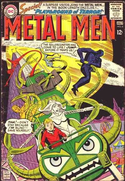 The Metal Men are set to perform at the Settlement House, for neighborhood children. En route, Platinum notices a lonely little boy, sitting on the stoop in front of his home. Platinum attempts to entice the boy into attending the show at the Settlement House, but he rudely rebuffs her. The Metal Men each take their turn performing feats for the children, starting with Mercury. Platinum, however, is distracted by the lonely little boy's refusal to attend. After Iron and Lead surprise their creator, Doctor Will Magnus, with a new trick, it's Platinum's turn to take the stage. Platinum, however, refuses.Leaving the Settlement House, Platinum returns to the lonely little boy. The boy, Timmy, is blind, a condition he hid from Platinum early. It is also due to his blindness that Timmy did not realize that one of the Metal Men was actually inviting him personally to their show. The rest of the team has followed Platinum back to Timmy, and warmly introduce themselves to the boy. With Timmy's mother's permission, the team offers Timmy the chance to spend an entire day with the Metal Men. Platinum tells Timmy that Magnus can cure his blindness, placing the inventor in an awkward position.Though Magnus knows it's hopeless, he goes through the motions of looking for a cure. Magnus locks himself within his laboratory, dreading the moment he must tell Timmy that he has failed. Meanwhile, the Metal Men take Timmy up into orbit, on board their rocket ship. Suddenly, caught in a powerful cosmic turbulence, the rocket is drawn away from Earth, into deep space. The Metal Men are tossed, haplessly, about the cabin. To save Timmy from injury, Platinum spreads herself out into a wire mesh between Timmy and the Metal Men. The rocket ship arrives at a distant planet, seemingly devoid of life.Strangely, the sole feature is a deserted amusement park. After checking the atmospheric conditions, the Metal Men take Timmy to the amusement park. Platinum notices that Timmy counts the steps and turns...