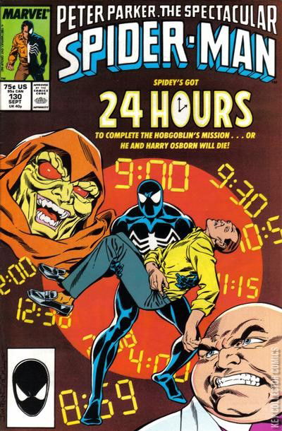 24 HOURS Searching for the Hobgoblin, Spider-Man crashes through the wall of a warehouse, demanding his foe to reveal himself. He finds his foe covered in casts and in a wheelchair. He warns the wall-crawler that if he is touched, Harry Osborn will die. When Spider-Man asks what happened to his foe, the Hobgoblin tells him that it is unimportant and explains his entire scheme... Two hours earlier, Harry Osborn received a package. Opening it, Harry found a pumpkin inside. Reading the note attached, it warns Harry that he has been poisoned and has 24 hours to live. AS the Hobgoblin had hopped, Osborn contacted Peter Parker, knowing that he had a connection to Spider-Man and would be able to convince the wall-crawler to help. Spider-Man doesn't understand how the Hobgoblin could be in the current condition. The villain explains that he was hired by a European mobster to steal a ledger from the Kingpin. He managed to break into the Kingpin's office and steal the ledger, but he tripped off the security guards. When he attempted to leave, his goblin glider was struck by stray bullets and blew up. It sends the Hobgoblin falling down the side of the building. He managed to break his fall by falling between balconies but was still seriously injured from the fall. He now tells Spider-Man that he wants the wall-crawler to finish his mission and steal back the ledgers and sell them back to the Kingpin for a hefty sum. Spider-Man refuses, but when the Hobgoblin tosses a tracking device at him, he informs Spider-Man that it had coated with the poison that will eventually kill Harry Osborn. The Hobgoblin orders Spider-Man to carry out his mission if he wants to get the cure and save himself and Harry. Instead of going along with the mission, Spider-Man goes to the lab of Dr. Curtis Connors to see if he can find a cure for the toxin that is poisoning him. After taking a blood sample and running some tests, Spider-Man determines an anti-toxin could be created in 36 hours. Unfortunately for the wall-crawler, neither he nor Harry has. Connors assures Spider-Man that he will do everything to see if he can find an existing and suitable anti-toxin. After Spider-Man leaves Connor's lab, he stops at a pay phone to call Harry Osborn to tell him to hang tight. After the call ends, Harry fears that his death will leave his son, Normie, to grow up without a father. Using the tracking device given to him by the Hobgoblin, Spider-Man tracks it to an illegal gambling ship. Spider-Man slips aboard the vessel and gets into a gun battle with the crooks who own the ship. Spider-Man succeeds in recovering the ledger, unaware that he is being observed by a group of men in a car. The web-slinger returns to Curt Connors home to see if he had any luck securing an anti-toxin. However, he discovers that Curt is being held hostage by some mobsters. Spider-Man makes quick work of them and is confronted by the Kingpin who has come to personally recover his stolen ledger. The Kingpin offers the anti-toxin in exchange for the ledger and a guarantee to punish the Hobgoblin for his transgression. As a show of good faith, the Kingpin brings Spider-Man the anti-toxin. He then uses it to cure himself and Harry just in time. Spider-Man then rushes to the warehouse where the Hobgoblin is hiding out. However, when he tries to ambush the villain, he has prepared for this contingency by protecting himself behind a transparent screen and escapes via a trap door. With his foe escaped, Spider-Man leaves and finds the Kingpin waiting for him outside. The Kingpin is not happy to see that Spider-Man failed to capture the Hobgoblin. Spider-Man is furious at being criticized by the mobster and tells the Kingpin he should be satisfied with the fact that he returned the ledger and swings off.