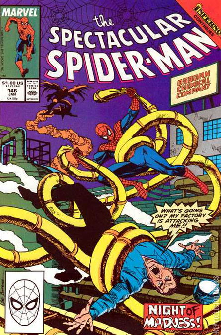 DEMON NIGHT On the roof of his condo at Bedford Towers, Spider-Man is in a good mood. He thinks about how he has returned to classes at Empire State University, his growing relationship with his wife Mary Jane, and how J. Jonah Jameson paid him well for photos of Spider-Man's capture of Mysterio. Even though his luck has been good, Spider-Man wonders when the old Parker bad luck will return. Deciding to shower before Mary Jane returns home with her cousin Kristy, Spider-Man is suddenly caught off guard when one of fan vent on the roof comes to life and tries to attack him. Remembering a similar incident happening during his battle with Mysterio, Spider-Man wonders if this is yet another attack from his foe. However, after he smashes the vent, he finds no traces of mechanical parts that would identify it as something Mysterio had put together. Spider-Man finds this unnerving and heads back into his condo. Inside, he finds that Mary Jane and Kristy aren't back yet, which saves him the trouble of having to sneak around. He is still bothered by the vent that attacked him, and thinks about the air feel strangely electric. Finding a note from MJ telling him that she and Kristy went out to buy groceries, he decides to take the shower he was thinking about earlier. Meanwhile, on Columbus Avenue, Mary Jane and Kristy have finished their shopping. Watching Kristy eating some fruit, she remarks about how much the young girl eats and not gain any weight. Kristy responds by saying she must be lucky before changing the subject to Mary Jane's modeling career. After a barrage of questions, she realizes that she is getting carried away and admits that she is excited to be visiting her cousin while her parents are traveling in Europe. As they enter Bedford Towers, they are unaware that a lamp post behind them has suddenly come to life. At that moment in Jackson Heights in Queens, Joe Robertson returns home after a walk around the block, a new record since he was released from the hospital. Although his wife, Martha, is proud of him, she is upset to have learned from J. Jonah Jameson that Joe intends to plead guilty before a grand jury on the charge of accessory to murder. The two argue over Joe's decision, ultimately ending when Martha goes back inside the house and slams the door behind her, leaving Joe to brood over his decision. Later that evening in Hicksville, Long Island, Harry Osborn awakens from a nightmare. He tells his wife Liz that it's the same as before, he sees his father's face in a mirror and then it turns into some kind of monster. Liz points out that these nightmares began since they moved into the old Osborn family home. Before they can discuss things further, their son Normie wakes up crying. Thinking that Normie had a nightmare as well, Harry decides that Liz is right and that they should move back to their home in New Jersey. This gives Liz a sigh of relief, knowing Harry's past history with his father, she fears what the place is doing to him and feels as though something is watching them. Liz's fears are justified, as above the Osborn home the Hobgoblin hovers briefly before flying away. The following day, Peter is taking his morning shower. When he is finished he gets soap in his eye and calls out to Mary Jane to get him a towel. He realizes, much to his embarrassment, that it is Kristy who brought him the towel, particularly when she makes a comment about how cute he looks. Outside the bathroom, Kristy asks Mary Jane if she can make some breakfast. Mary Jane allows it, but jokingly warns her to stop flirting with her man. Finally given some privacy, Peter gets dressed, thinking about how uncomfortable having Kristy around makes him feel. His thoughts are interrupted when his phone begins to ring. It's Harry Osborn who is disturbed by something happening at one of the Osborn chemical plants in Manhattan and asks if Peter can come out and see it for himself. Hearing Harry's voice, Peter worries that he might become the Green Goblin again. He assures Harry he will get out to the plant as soon as possible. Later, at the Starlight Room in Midtown Manhattan, Ben Urich is on the scene of yet another murder of members of the Kingpin's mob. The slaughter of a room full of people is a grisly sight for the otherwise hardboiled reporter. Lieutenant Frank Farrow shows him a message written in blood on one of the tablecloths. It reads "Kingpin, Wolves Kill". That's when the Arranger arrives demanding to know who is in charge of the situation. When Farrow demands answers from the Arranger, he insists that his employer is a respectable businessman, and refuses to talk even if there is a looming gang war on the horizon. Ben Urich calls this into the Daily Bugle, telling Joy Mercado the whole story. As they are talking Glory Grant approaches Joy and tells her to pass along the message that J. Jonah Jameson is looking for Ben. She explains that since Joe is away on leave, Jameson is taking a more active role in running the Daily Bugle.[Continuity 11] Just then, Jameson comes out of his office demanding to speak with Kate Cushing. He is upset that she allowed the paper to feature a front-page story about the apparent poltergeist plaguing the city. Jameson doesn't buy into the reports of supernatural activity across the city and shows her a more responsible headline changing "Poltergeist!" to "Poltergeist?" and leaves. Kate is furious but admits to herself that Jonah is right. Glory tells Kate not to worry about Jonah, pointing out that after working with him all these years she has learned that he is more bark than bite. Glory then goes on her lunch break and in the lobby of the Bugle Building she bumps into Eduardo Lobo. Unaware of his criminal background, she is instantly taken by his charm and agrees to allow him to take her out for lunch. Meanwhile, at the Osborn Chemical Plant, Harry Osborn tells Peter about the strange nightmares he has been having recently. Peter asks why Harry would move bac