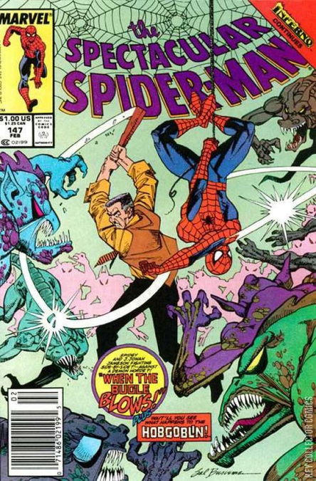 WHEN THE BUGLE BLOWS Following his defeat at the hands of Spider-Man and the Green Goblin, the Hobgoblin flies around the inferno that is New York City lamenting about his recent defeat. He is furious that he has been prevented from obtaining the Goblin Formula to enhance his strength, believing it his right as the Hobgoblin. Suddenly, the Hobgoblin is ambushed by a horde of demons, who aren't fooled by the Hobgoblin's costume. Not in the mood for a battle, the Hobgoblin slays the demons. He could care less about the demon invasion plaguing New York, however, their comments about being "dressed like a demon" has given him an idea. Elsewhere in the city, Spider-Man web-slings across the city. He is shocked to see what has become of his city and wishes he wasn't so caught up dealing with both Harry Osborn and the Hobgoblin so he could do something about the situation. He decides to pay a visit to the Daily Bugle as Peter Parker to see if he can learn what's going on and call his wife Mary Jane and make sure she is okay. Unfortunately, a demonic wind picks up and throws Spider-Man into the side of a building. He grips onto a gargoyle statue to prevent himself from falling to his death. Unfortunately, the gargoyle is alive and it bites him, filling his body with poison. Falling to the ground, Spider-Man picks up his body and stumbles toward the familiar sight of the Daily Bugle Building. Upstairs, J. Jonah Jameson is leading his staff in fighting off demons that have invaded his office. Although Jameson is scared out of his mind, he tries to keep a brave face for his employees. He is surprised to see Spider-Man emerge from the elevator and when the wall-crawler collapses to the floor, he orders Joy Mercado to give the masked hero medical attention. While elsewhere in Manhattan, Mary Jane organizes her colleagues at a modelling shoot, fighting off demons and fortifying her position. She worries about her husband Peter, as she hasn't seen him since he said he was going to Long Island to see Harry Osborn. Above the city, the Green Goblin is amazed that he was able to use his skills to defeat the Hobgoblin. He can't wait to get home to tell his wife, even though she might be worried he became the Green Goblin again. However, his attempts to return to New Jersey are blocked by a water demon, who is keeping people from leaving New York. Harry decides to head to Queens to make sure Peter's Aunt May is safe. Queens is also under siege by demons, Joe Robertson is accosted by a neighbor wielding a chainsaw. Joe quickly disarms him with his cane. He is joined by his wife, son Randy, and his wife Amanda, who are trying to make sense of what is going on in the city. Witnessing as something possesses his neighbors, Joe tells his family that after being afraid of Tombstone for so many years, he isn't going to go down without a fight. Meanwhile, back in Manhattan, the Hobgoblin arrives at the Empire State Building, the epicenter for the Inferno invasion. There he is confronted by demons indenting to eat him. However, they relent when the Hobgoblin demands to see their master. Soon he is visited by the demon known as N'astirh, who demands to know what he wants. The Hobgoblin offers his soul in exchange for power, a request that N'astirh finds incredibly amusing. Although N'astirh doesn't have a use for such a tainted soul, he decides to grant the Hobgoblin with his wish as the human was able to make him laugh. N'astirh then blasts the Hobgoblin with mystical energy sending him flying across the city. Back at the Daily Bugle, J. Jonah Jameson continues to lead the defense against the demons invading the building. Spider-Man wakes up and finds himself among the injured just in time to save Ben Urich from an attacking demon. He finds himself in the somewhat amusing position of fighting side-by-side with J. Jonah Jameson. However, with the aid of Spider-Man the Daily Bugle staff manages to turn the tide. With the battle over, Jonah allows the horror of the battle finally sink in and he bites through his cigar. This is amusing to Spider-Man who asks someone to get a camera. That's when Jonah notices that the battle opened up Spider-Man's wounds and he has begun to bleed through his bandages. Spider-Man assures Jonah that it only hurts when he laughs and passes out from blood loss. At that moment in Central Park, the Hobgoblin recovers from his fall and looks into the murky waters. He is horrified to see that N'astirh not only gave him the power he asked for, but also changed him into a hideous demonic form.