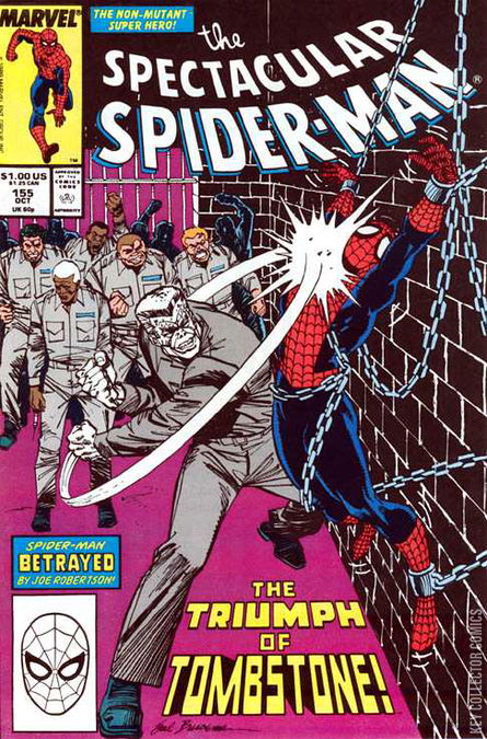 CRASH OUT! Spider-Man is sneaking into Lewisburg Federal Prison, although this is a dangerous situation, the wall-crawler thinks about how this is a change of pace from the past few weeks. He recalls how New York was recently in the middle of a gang war between the Kingpin and the Lobo Brothers. This ultimately led to his friend Glory Grant shooting her lover, Eduardo Lobo as he fought Spider-Man. Much to Spider-Man's shock, Glory revealed that she shot Eduardo by accident, as she was aiming for the wall-crawler. On top of was the revelation that his Aunt May apparently has only six months to live. He recalls his struggle trying to broach the subject with Aunt May, but fears that he would be invading her privacy. That's when his Aunt May told him that he had a call waiting from Randy Robertson. The call was about Randy's father, Joe, who has been in prison after being found guilty of being an accessory to murder. This is why Spider-Man has come to the prison, as he feels that he owes Joe for always treating him fairly. Arriving at Joe's cell, Robertson is upset that the wall-crawler answered his call for help. Suddenly, Spider-Man's spider-sense goes off, allowing him to narrowly avoid a blow from Tombstone, who is outside of his cell. While Spider-Man is distracted, Robertson injects Spider-Man with a needle. As the drugs in his system knock him out, Joe apologizes to Spider-Man for betraying him. Gloating over his victory, Tombstone explains that the reason Joe is helping him is that Robertson is afraid of him. Tombstone then begins beating on Spider-Man, to avenge his previous defeat at the hands of the wall-crawler. Meanwhile, back in Forest Hills, Mary Jane is accompanying Aunt May to a bingo game that is behind held at the local church. Along the way, Aunt May tells Mary Jane that she and Peter need to enjoy their youth while it lasts. This gets Mary Jane thinking of all their problems, and wants to relate to her but doesn't know how to do so without letting on that she knows about her apparent health condition. Although he is in prison he has been making her life a living hell. However, they soon discover that this evening is the senior citizens for service meeting that evening. Even thought she mixed up the dates, Aunt May insists that they should still check it out. Aunt May is impressed with the volunteer efforts that senior citizens in the neighborhood are putting in and decides to see what aid she can offer. Mary Jane is amazed that she could think of others when she apparently has so little time left. At that moment, at the Osborn Chemical Company, where repairs are almost complete following the damage that was done during the Inferno crisis, Harry Osborn shows Flash Thompson around the facility but expresses how the commute from his home in New Jersey has put a strain on his relationship. When Harry offers Flash a job as the construction supervisor, Flash declines the offer. He complains about how his life has gone nowhere since high school. Harry, assures Flash that sooner or later his luck is about to change. During this entire conversation, the pair are unaware that they are being watched by the Black Cat. Back at Lewisville Prison, Spider-Man has been chained to a wall. When the hero wakes up, he tells Tombstone that if he wasn't drugged he'd wipe the floor with him. Tombstone is impressed with Spider-Man's bravery and begins laying into him. Watching among the other prisoners and a crooked guard, Joe Robertson begs Tombstone to stop. The mobster continues to slap around the hero until the guard stops him. The guard warns Tombstone that if he keeps it up he will kill Spider-Man, and he wants to see Tombstone get out of prison. Tombstone agrees and he and his men depart, leaving Joe alone with the wall-crawler. Joe apologizes to Spider-Man for what has happened, telling him that he has been acting out of fear. When Spider-Man tells him to let go of his fear or it will destroy him. Joe explains that he lost all hope when Tombstone killed his friend Bruiser and leaves Spider-Man behind. Later, the guards of the prison notice a number of helicopters heading toward the prison. They have come to free Tombstone and his gang. As the criminals head toward the choppers, Tombstone takes Joe Robertson and Spider-Man with him. The guards try to stop them, but can't shoot for fear of hitting Spider-Man. When the choppers arrive, they open fire on the guards, forcing them to run for cover. Before they can get into the chopper, Spider-Man breaks free from his bonds having shaken off the effects of the drugs. As Spider-Man is busy with Tombstone's minions, the mobster makes his escape with Joe Robertson. Spider-Man sees the pair trying to make their escape and leaps up onto the helicopter. However, Spider-Man is still weak and just manages to grab the runner of the helicopter. Tombstone takes advantage of this by kicking the wall-crawler in the hopes of knocking him loose. Robertson begs Tombstone to stop, but when the mobster refuses to listen, Joe overcomes his fears and pushes himself and Tombstone over the edge. Spider-Man watches helplessly as Joe Robertson and Tombstone fall to the ground below. The wall-crawler quickly scrambles into the helicopter where he takes down the gunmen. He then demands the pilot to land near where Joe and Tombstone fell. However, there is nowhere for them to land in the thick forest. Fearing the worst, Spider-Man thinks that if Joe did die, at least he died like a man.