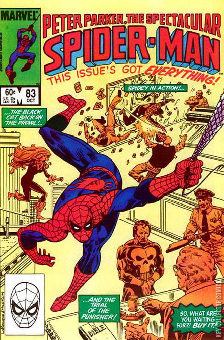 DELUSIONS Out on the prowl again after weeks of recovery, the Black Cat rescues a stray kitten from a pack of alley cats. When the kitten sucks up to her, Felicia decides to keep it for herself before passing out due to her still being weak from her injuries. Spider-Man meanwhile has tracked down a counterfeit credit card ring. After smashing up the operation Jean DeWolff and her men take over and arrest the crooks. Spider-Man leaves the scene to go rendezvous with the Black Cat at the hospital, leaving Jean DeWolff wondering to herself if Spider-Man would ever call on her if he left the Black Cat. Swinging across the city, Spider-Man mulls over his recent encounters with the Hobgoblin knowing that the villain had common crook Lefty Donovan pose as him and die to make everyone think the Hobgoblin is dead. His thoughts then turn to the Punisher who is being arraigned in court today making work for Peter Parker in the way of photographs for the Daily Bugle. Arriving at the hospital, Spider-Man is shocked to find that Felicia is not there and fears that she may have been attacked by one of his foes. When she returns moments later, Spider-Man is furious that she went out in her Black Cat costume, feeling that she broke her promise never to be the Black Cat again. She tells Spider-Man she promised to go straight, not stop going about in her costumed identity. Spider-Man, fearful that Felicia might get hurt again if she gets into costumed adventuring needs time to think and leaves. Later at the Daily Bugle, Peter Parker meets with J. Jonah Jameson, Joe Robertson, Ben Urich and Glory Grant to prep for the Punisher's arrangement later that day. Ben pulls out all the files they have on the Punisher and go over his history: The file explains that the man who is the Punisher is Frank Castle, a former Viet Nam veteran who became a police officer after the conflict. After his entire family was murdered by mobsters he took on the identity of the Punisher to get revenge on all criminals for his innocent families deaths. He had since clashed with the likes of Spider-Man and Daredevil while operating outside of the law. With the report read, Jameson goes off on another triad about costumed menaces and asks his staff to consider when other costumed vigilantes like Spider-Man may snap, a suggestion that shakes Peter to his core. Later at the arrangement for the Punisher, District Attorney Blake Tower tells the court that he believes that Castle should be tried for all of his crimes as he willingly committed them. However, the defense argues that since the murder of his family Frank Castle has gone completely mad and needs to be institutionalized. Upon hearing this, Frank refuses to believe that he is mad and lashes out, telling the judge that the entire system is crazy for letting criminals walk the street before collapsing in a nervous breakdown. As they are lead away, Peter begins to wonder if this is his fate if he continues operating as Spider-Man.