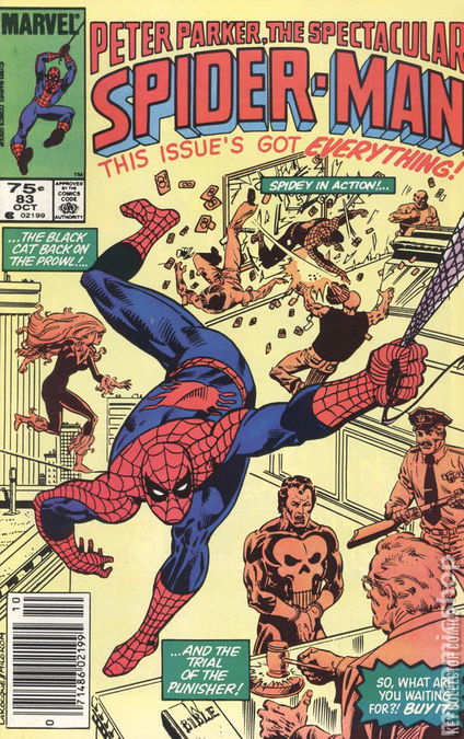 DELUSIONS Out on the prowl again after weeks of recovery, the Black Cat rescues a stray kitten from a pack of alley cats. When the kitten sucks up to her, Felicia decides to keep it for herself before passing out due to her still being weak from her injuries. Spider-Man meanwhile has tracked down a counterfeit credit card ring. After smashing up the operation Jean DeWolff and her men take over and arrest the crooks. Spider-Man leaves the scene to go rendezvous with the Black Cat at the hospital, leaving Jean DeWolff wondering to herself if Spider-Man would ever call on her if he left the Black Cat. Swinging across the city, Spider-Man mulls over his recent encounters with the Hobgoblin knowing that the villain had common crook Lefty Donovan pose as him and die to make everyone think the Hobgoblin is dead. His thoughts then turn to the Punisher who is being arraigned in court today making work for Peter Parker in the way of photographs for the Daily Bugle. Arriving at the hospital, Spider-Man is shocked to find that Felicia is not there and fears that she may have been attacked by one of his foes. When she returns moments later, Spider-Man is furious that she went out in her Black Cat costume, feeling that she broke her promise never to be the Black Cat again. She tells Spider-Man she promised to go straight, not stop going about in her costumed identity. Spider-Man, fearful that Felicia might get hurt again if she gets into costumed adventuring needs time to think and leaves. Later at the Daily Bugle, Peter Parker meets with J. Jonah Jameson, Joe Robertson, Ben Urich and Glory Grant to prep for the Punisher's arrangement later that day. Ben pulls out all the files they have on the Punisher and go over his history: The file explains that the man who is the Punisher is Frank Castle, a former Viet Nam veteran who became a police officer after the conflict. After his entire family was murdered by mobsters he took on the identity of the Punisher to get revenge on all criminals for his innocent families deaths. He had since clashed with the likes of Spider-Man and Daredevil while operating outside of the law. With the report read, Jameson goes off on another triad about costumed menaces and asks his staff to consider when other costumed vigilantes like Spider-Man may snap, a suggestion that shakes Peter to his core. Later at the arrangement for the Punisher, District Attorney Blake Tower tells the court that he believes that Castle should be tried for all of his crimes as he willingly committed them. However, the defense argues that since the murder of his family Frank Castle has gone completely mad and needs to be institutionalized. Upon hearing this, Frank refuses to believe that he is mad and lashes out, telling the judge that the entire system is crazy for letting criminals walk the street before collapsing in a nervous breakdown. As they are lead away, Peter begins to wonder if this is his fate if he continues operating as Spider-Man.