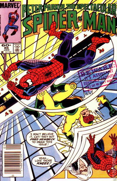 BUGS! At the Marvel Comics office Al Milgrom is furious that his pencils for this months issue have all been rejected. Heading to the office of Danny Fingeroth. Instead he finds assistant editor Bob DeNatale in his place, and demands some answers. Bob explains that Danny has gone with the other Marvel editors to the San Diego Comicon and left all the assistant editors in charge of the company. Bob goes on to explain that although he likes Al's work he has a different vision of Spider-Man and introduces the man he's hired to write this months issue of Peter Parker: Fred Hembeck. When Hembeck turns over his finished pencils DeNatale is impressed much to Milgrom's chagrin. The story is as follows: The Fly is back in New York, seeking to get revenge against Spider-Man and J. Jonah Jameson, the Wall-Crawler for his earlier defeat and Jameson for turning him into an inhuman freak. However along the way he stops to terrorize a garbage scowl's crow and much to his horror and disgust finds himself compulsively eating the garbage much like a real fly would. Elsewhere in the city, Spider-Man is trying to get away from the Black Cat so that he can contemplate their relationship, however the Cat won't let him and tries to confront him about the situation. Finally stopping the Wall-Crawler the two talk things out. Spidey admits that he is concerned for the Black Cat's safety if she continues to act as his side-kick however she explains to him that she has the same need for adventure he does and the two sort it out and decide to make their partnership as crime fighters work. Spider-Man takes Felicia to the building across from the Daily Bugle and tells her that he works for the newspaper. Felicia is surprised to learn that Spider-Man uses a secret identity and has a day job. Spidey tries to explain that when he got his powers his old life didn't stop. Before they can discuss this further, Spider-Man witnesses the Fly crash into the window into J. Jonah Jameson's office, where Jonah has been working on a new story. As they swing over to the Bugle building, Spider-Man explains his previous encounter with the Fly. When he tells Felicia to stay behind, she refuses and follows after him. While back in the office the Fly threatens Jonah until he is distracted by, and begins licking, a spilled can of soda. As Spider-Man and the Black Cat come to the rescue, Jonah learns that the two costumed adventurers are dating and tries to wrap his head around the concept. The battle leads them down into the Daily Bugle's printing press with Jameson in tow. There the Fly becomes distracted by a sandwich and the heroes eventually manage to use it to trip up the villain leaving him easy prey when Spider-Man wraps him up in webbing, and save Jameson whom the Fly attempts to drop into the rolling printing press. With the Fly stopped, Spider-Man storms out and warns Jameson to do whatever it takes to restore the Fly to normal or next time the hero will not come to his rescue. The story narrative is interrupted by the return of Danny Fingeroth returns to the office and is furious that Al Milgrom's pencils were replaced by that of Fred Hembeck and replaces the rest of Al's pages for the remainder of the story. Spider-Man and the Black Cat make a stop on a rooftop where the Black Cat found the experience of seeing Spider-Man's civilian job exciting and asks if she can see where he lives. This cause an inner struggle with Spider-Man as he doubts once again if the Black Cat could love both Spider-Man and Peter Parker, but ultimately decides to take the chance and agrees to take her to see his place.