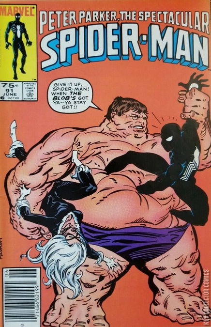 IF IT WASN'T FOR BAD LUCK... The Black Cat is fleeing from Spider-Man, as she isn't convinced that it is her lover in a new costume. He convinces her that it is really him, and explains that he and a number of other heroes and villains were transported to another world by the alien Beyonder to see who was the better of the two groups. He explains that along the way he obtained this new alien costume, and after the heroes victory they were all transported back home. He then shows her one of the costumes features: that can change shape and expose parts of his body at will. They two take advantage of this for a romantic interlude on a rooftop. While at Madison Square Garden, a circus has been set up which includes former mutant terrorists the Blob and Unus the Untouchable as their attractions. The Blob arrives just as Gunther's powers are going out of control. The Blob, being the only being who can resist his friend's force field forces his way into the rapidly expanding circus tent to find his friend floating in mid-air. His powers have spiraled out of the way so bad that he is now repelling even the air that he needs to breath. Without any air Unus soon passes out and the Blob, believing that his friend is dead breaks down into tears and vows to make everyone pay for taking away his only companion. The next morning, Peter awakens and summons his costume to bond with him and have it change into street clothes and gets ready to meet the day. Outside his apartment, he is scolded by his landlady Mrs. Muggins over his overdue rent and berates him for having a "kinky woman" visit his apartment she demands that Peter get her his rent pronto. Needing fast cash Peter pays a visit to the Daily Bugle and after being teased by his coworker's thanks to the Black Cat's visit there, Peter waits to meet with Joe Robertson to see if he has any assignments. Much to Peter's disappointment all of the freelance jobs have been taken up by others due to his absence on Battleworld in the Secret Wars and Joe, now too busy as Editor of the Daily Bugle sees him out of his office. Peter returns to his apartment where he decides to try and mend broken fences with Aunt May who was terribly upset when Peter dropped out of University. When he calls Nathan Lubensky answers the phone and when May learns that it is Peter she has him tell Peter that she isn't home. Peter overhears this and ends the call and is upset that his Aunt is being so stubborn with him. Flash Thompson knocks on his door to come and talk. Peter invites him in and Flash confides in Peter that he doesn't like how his girlfriend Sha Shan has become more and more independent since immigrating to America from Vietnam. He also expresses how he feels like he isn't anyone important like when he was in high school or in the military. Before Peter can give him any advice, he notices the Black Cat knocking at his window and quickly sees Flash out the door. Flash sees this as Peter snubbing him and begins to believe that Peter was just the sort of creep he thought he was in high school and silently vows to show everyone. Seeing the Black Cat in, Peter scolds her for not being more cautious with protecting his secret identity when she tells him it's an emergency a man is going on a rampage into the streets. Quickly shifting his clothing into his Spider-Man costume, the Wall-Crawler joins Black Cat to where the Blob is going on a rampage through the streets. Spider-Man convinces the Black Cat to stay behind as back up and hands her his camera to snap photos of the battle for him and dives down at the Blob. Although Spider-Man catches the Blob off guard, he makes the mistake of striking the heavy-set mutant, getting his hands stuck in his ample gut. As Spider-Man struggles to get free, a shadowed figure watches over the battle to watch over and learn Spider-Man's skills and abilities for a battle in the future. Seeing that Spider-Man is in trouble, the Black Cat jumps in pulling a rope up around the Blob's neck. As the Blob struggles to get free he topples over backward. With Spider-Man and the Black Cat out of harm's way, Spider-Man shoves the Black Cat aside and attempts to fight the Blob on his own. The Black Cat continues to intervene, her bad-luck powers causing the Blob to trip up until ultimately he breaks through the concrete street. When the Black Cat quips that the Blob's aggressive behavior won't make him any friends, this strikes a chord with the fat mutant. Telling them he had a friend who died recently, the Blob decides to not fight anymore and sits in the middle of the 42nd street to grieve, blocking all the traffic. Convinced that the Black Cat can handle herself in combat, Spider-Man thanks her leaving the Black Cat to wonder if she should tell him about her newly acquired powers. When Jean DeWolff arrives on the scene, Spider-Man and the Black Cat leave her to deal with the Blob, who's sobbing fit has caused a massive traffic jam.