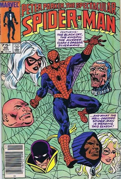 THE FINAL ANSWER! A winter storm is raging in New York City, and Cloak is keeling over in pain. He is suddenly forced to eject Silvermane and the two drug dealers that he pulled into the dark dimension in his cloak. The pain of such a forced expulsion causes him to pass out in the snow, leaving Silvermane free to resume his obsessed hunt for Dagger. While at the apartment of Peter Parker, having just turned over his alien costume to Reed Richards for examination, he is busy testing out his old web-shooters and mulling over the fact that Mary Jane just revealed the fact that she knew he has always been Spider-Man. Donning his old costume, he meets up with the Black Cat and asks her to help him resume his search for Dagger. This leads to a jealous snit between her and Peter over his concern for Dagger, and Mary Jane being at his apartment earlier. Spider-Man assures her that she is the only woman for him and the two depart, but not without Black Cat mulling over how much she really knows and about Silvermane's resurrection due to the fact that the Kingpin gave her new bad luck powers. While back at the Kingpin's headquarters, Kingpin is furious that Dagger is too weak to provide the light energy that might make his ailing wife better again. The Answer explains that Silvermane must be draining it from her remotely due to their link. Just then Silvermane bursts into the Kingpin's lair, fighting off his guards with relative ease. While at the home of Mary Jane Watson, Mary Jane mulls over the fact that she knows that Peter is really Spider-Man and how she doesn't like how he risks his life. Feeling lonely, she is happy for Peter in finding the Black Cat, someone who can share his adventures with. She decides to hang out with a kindred spirit and tries to give Flash Thompson a call, but there is no answer on the phone. Thompson, as it turns out, is braving the storm, fuming over what he believes to be an affair going on between Sha Shan and Peter Parker. Deciding to take cover he runs into Betty Leeds as is trying to hide from the Asgardian warriors that are running loose on the streets of New York. He swears to keep Betty safe, which is something that raises a stir in Betty. Later, Spider-Man and the Black Cat try fruitlessly to find Dagger when Black Cat lets slip that the Answer probably took her to the Kingpin's hideout. Spider-Man calls her out on how she could know this and she tells him she learned it while he was gone on the Secret War through her underground connections and just thought to mention it now. Spider-Man is suspicious and tells her that she's been acting strange ever since he got back from the other side of the universe. He also tells her that while on the Secret War, Captain America and Mr. Fantastic both told him how she went around the super-hero community to get super-powers before he vanished and when he got back she suddenly has powers. She tells him that she knows the Answer is working for the Kingpin and that's it, and Spider-Man decides to let it go for now. As they head to Kingpin's base, Cloak revives and goes there as well. This soon leads to a full out battle between Silvermane, Kingpin, the Answer, Spider-Man, Black Cat and Cloak as the heroes try to fight their way to Dagger. The Kingpin is attempting to keep everyone away so that his machines might filter Dagger's powers to revive Vanessa. Their attempts to keep Silvermane from getting to Dagger fail and upon touching her he revitalizes her, seemingly incinerating the Answer in the process. Also regaining his mind, Silvermane flees the scene. With the villains defeated, Kingpin begs Dagger to heal his wife. Dagger refuses, instead she uses her powers to revitalize Cloak and they flee. The Kingpin vows revenge against Spider-Man and the Black Cat who flee the scene leaving the Kingpin to tend to his wife. While at the Baxter Building, the sentient alien costume that Spider-Man has worn until recently attempts to escape from the container that Reed Richards has put it in.