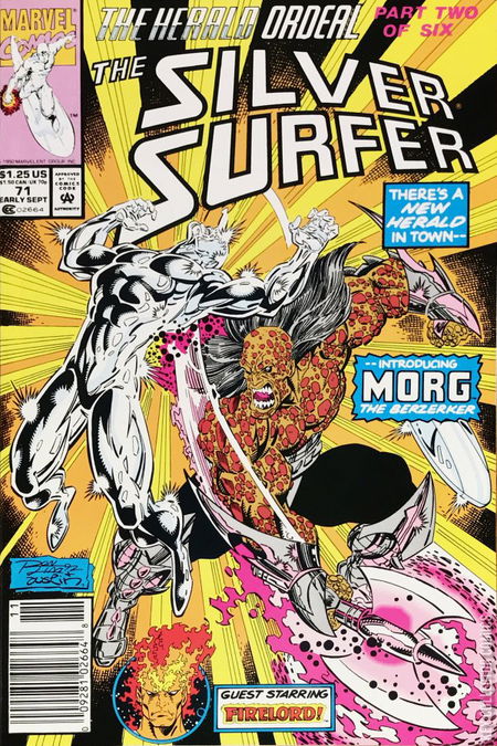 The Herald Ordeal part 2 of 6. Silver Surfer fights with Morg. His power is great and he is able to subdue the Surfer and bring him before Galactus. Galactus tells him that he will cloak his ship from the Surfer forever and to not interfere with him again. Morg warns him that their second encounter will not be as pleasant and knocks the Surfer unconscious.Meanwhle, Doctor Mandibus begins his work on Nebula. Geatar tells him to keep her personality as it was.The Surfer awakens and realizes he cannot face this threat alone. He seeks out Firelord and helps him battle some energy traders that are trying to capture him. He tells Firelord that Galactus now has an unworthy herald and they must stop him. They travel to find Nova.Morg has found his first planet for Galactus to consume. For his own amusement he kills the entire population.