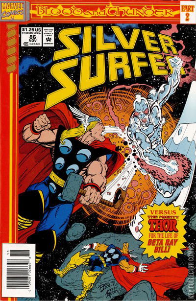 "Friends & Foes" The Surfer meets up with Beta Ray Bill again, but their reunion goes to ruin when they are attacked by a raging, out-of-control Thunder God! Thor's out for blood and nothing can stop him! Also guest-starring Adam Warlock and Pip the Troll! The Silver Surfer has followed Beta Ray Bill to help him find a mad Thor and finds him about to be killed by Thor. The Surfer gets in the way and tries to talk Thor to his senses but he will not listen. Bill awakens and begins to battle with Thor again and manages to stop him temporarily. He tells the Surfer that Thor has the Warriors' Madness.Thor is completely under the sway of this Dark Valkyrie, but she is just part of his imagination. Speaking with her gains his strength back and he continues his assault, quickly defeating Beta Ray Bill. The Surfer uses his board to get him at a safe distance and begins to fight with Thor. But Thor has plans to destroy any in his path to the ultimate destruction of Asgard and is not going to let the Surfer get in his way. Thor smashes the Surfer with his hammer, slamming him into the planet below.When Thor comes down to the surface to finish him off he is met by Adam Warlock and Pip. Adam tells Thor that he wants to help save his soul.