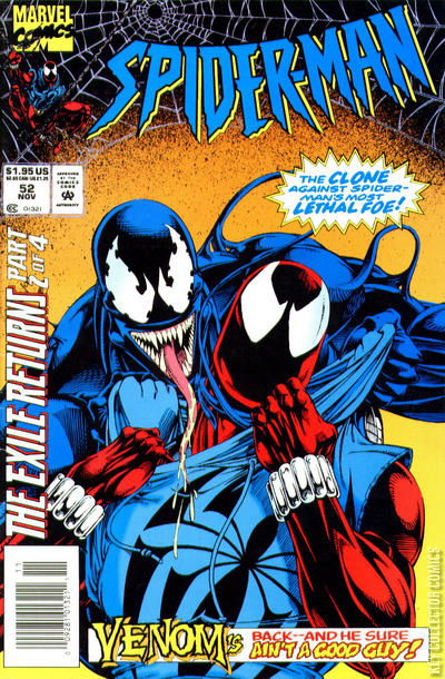 THE EXILE RETURNS PART 2 - DEADLINE Daily Bugle Ken Ellis is pleased that J. Jonah Jameson put his story about Venom on the front page of the paper. He then gets a phone call from an informant and heads out into the rain. He is looking forward to the interview he is trying to get, as Ellis figures it will put him above the Bugle's star reporter, Ben Urich. He stopped by the Spider-Man clone in his new costume. The clone wants to talk to Ellis. When the reporter tries to brush him off, the Spider webs his feet to the ground. This masked hero denies that he is Spider-Man, or that he is a hero. However, he wants to know where Venom might be. Ken wants an exclusive interview with both Eddie Brock and this newcomer and tells this new wall-crawler that Venom was last seen near the Roosevelt Island Tram Terminal. After hearing this, the mystery web-slinger takes off to confront the symbiotic creature. At the tram station, Venom sits atop the building wondering why people are afraid of him, wondering why they don't recognize that he is a hero now. Venom has just taken down a group of crooks and now the police have surrounded him. He figures this is because he still has to pay for his sins, namely being responsible for birthing Carnage, whom he has vowed to destroy once and for all. As Venom tries to figure out what to do next, he is unaware that someone is watching him from nearby. Not far away, the Spider-Clone swings across the city, wondering if he can really take on Venom, a foe that was the real Spider-Man was only barely able to defeat in the past. Arriving at the tram station, the clone attacks Venom. As the two come to blows, Venom quickly realizes that although this foe has Spider-Man's moves, he is not his foe. Venom slashes the clone across the chest. When the clone admits that he is a "fake", Venom moves in to make a killing blow. That's when they were interrupted by a female symbiote, who has come to warn him that the authorities have called Guardsmen into the area. Venom refuses to listen to the female symbiote and attacks her. This allows the Spider-Clone to slip away to treat his wounds. By this point, Ken Ellis arrives on the scene and slips past the police cordon in order to get a first-hand account of the battle. He witnesses Venom and the female symbiote battle each other, neither aware that an innocent woman is trapped in her car nearby. Meanwhile, the Spider-Clone has webbed up his wounds so he can stop this battle. Still doubting himself, the clone swings down to the battle below. Spotting the woman trapped in her car, he rips the door off the hinges to free her. As Venom and his "child" continue to fight, a man stumbles off the balcony of a nearby apartment building. The Spider-Clone saves this man too and then turns his attention back to the two symbiotes. The pair has taken their fight to the nearby tram. Although the female symbiote still insists that she just wants to talk, Venom refuses to give up the fight. With the tram about to be shaken off its cable, the Spider-Clone swings up and knocks the two symbiotes into the water below. He then saves the tram driver just as the car falls loose. When he brings the tram driver to the ground, everyone hails the Spider-Clone as a hero. When Ken Ellis asks for an interview, the clone denies being a hero and says that he is barely a man before swinging away. Still, Ellis has a killer story and decides to name the new hero the Scarlet Spider. Not far away, Venom emerges from the waters vowing to track down the Spider-Man impostor and ending his life.