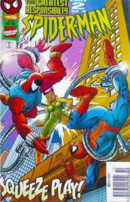 THE GREAT RESPONSIBILITY PART 2 - THE KICK INSIDE Peter Parker sits up in bed watching his wife Mary Jane sleep. After feeling his unborn child kick for the first time earlier that evening, he can't help himself and reaches out to see he can feel it kick again. When he does so, he wakes up Mary Jane, who understands Peter's excitement, but insists that she needs some sleep. Since he Peter is alert and awake, Mary Jane suggests that Peter go out web-slinging to burn off energy, telling him to be safe and make it back in one piece. Changing into Spider-Man, Peter goes web-slinging, happy with where his life is going, even though he just learned that he is actually a clone. He finally believes that his life is going in the right direction and wonders if Ben Reilly can say the same. At that moment, the Scarlet Spider is reeling back from the revelation that the new Doctor Octopus is the daughter of his friend Seward Trainer. Despite this, the new Doctor has broken into Seward's lab and the Scarlet Spider is intent to stop her. Doctor Octopus is particularly angry that Seward has treated Ben like a son while abandoning and ignoring his own daughter. When the Spider leaps at her, he slams right into her force field. She then tosses Seward into his would-be savior. Seward demands to know what his daughter wants, but she is uninterested in sitting down to talk about it, feeling that that opportunity is long past. She has come to take his father's research on cyberspace, but he refuses to hand it over. As the Scarlet Spider insists on getting Seward to safety, but Trainer refuse to run from his own daughter. Still, the web-slinger insists on it and leaps out a nearby window with Seward in his arms. Meanwhile, Spider-Man has been spending his time catching crooks all over the city. Spotting some squad cars speeding across the city, the wall-crawler's spider-sense begins going off and he decides to investigate. For some reason, he thinks that this might have something to do with the Scarlet Spider. At that same moment, the Scarlet Spider has gotten Seward to safety and demands to know more about this new Doctor Octopus. Seward, however, points out that this isn't the time to go into his family history. The Spider is inclined to agree when his spider-sense goes off warning him of an ambush by Doctor Octopus. He tells Seward to get to safety as he engages in battle again, but the Scarlet Spider can't get through the Doctor's force field. That's when Spider-Man arrives to lend a hand. Unfortunately, Doctor Octopus manages to strike Spider-Man from behind, sending him over the side of the roof. Disorientated, the wall-crawler in unable to prevent the Doctor from getting a good grasp on him. She then offers a trade, Spider-Man for her father. While over the edge of the building, Spider-Man is slowly being strangled. As he struggles to break free, he fears for what might happen to his wife if he were to die right here. Meanwhile, the Scarlet Spider manages to disorientate Doctor Octopus with his impact webbing, which manages to weave it's way up her mechanical arms and through the tiny gaps in her force field. He then leaps over the edge of the building and rescues Spider-Man, swinging to the ground below. Unfortunately, this allows Doctor Octopus to get away. By the time the authorities arrive, Seward Trainer decides that his daughter is out of control and agrees to let the Scarlet Spider stop her his own way. When he asks Spider-Man to help, the wall-crawler is still shaken by the fact that he almost died. He has a lot of thinking to do and swings away to talk to Mary Jane before he decides what to do next.