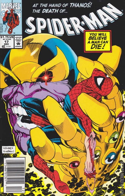 NO ONE GETS OUTTA HERE ALIVE! After a chemical accident, Spider-Man’s consciousness is separated from his body and he enters an alternate plane where Death herself lies in wait! Not to mention Thanos is there too, in possession of the Infinity Gauntlet! In this issue Spider-Man dies! That's no joke. Attempting to save the life of a little girl the wall-crawler is killed. Now, in an ominous journey through the afterworld, Spider-Man comes face-to-face with the Mad Titan himself, Thanos, and his dark mistress, Death! Is this truly the end of everyone's favorite friendly neighborhood Spider-Man?