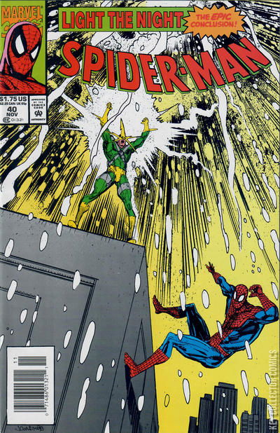LIGHT THE NIGHT! PART 3 Looking to make something of his life, Electro has wired himself into the electrical grid atop the Top of New York Hotel. He has absorbed every bit of electricity from the city and is now using his body to light all of Manhattan. Down below, at a charity gala, people are in a panic after the black-out. However, it is not because they are aware of Electro, but because a petty crook named Charlie Buchanan was attempting to rob the gala with fake bombs. Spider-Man tries to calm people down, convincing them that "Crook-Man's" explosives are fake. That's when someone enters the ballroom and says there is an explosion on the roof. Spider-Man leaves to check it out, allowing Buchanan to try and make his escape. However, he is spotted by J. Jonah Jameson who nabs the crook and places him under citizen's arrest. That's when Sarah Klein, the daughter of a close friend, tells Jameson that they need to get out of the building in case there is a fire on the roof. Meanwhile, Spider-Man arrives on the roof of the building and sees what Electro is up to. The villain is happy to see the wall-crawler for once, as this is his big moment. He tries to blast Spider-Man, knocking the hero off the roof. Inside, people panic due to the sounds of battle and Jonah loses sight of Sarah, leaving the publisher to wonder what he should do. At that same moment, Spider-Man saves his life by snagging the side of a rooftop gargoyle statue, which breaks his fall when he crashes through the roof of the nearest building next door. Satisfied that he has destroyed his foe, Electro begins increasing the amount of electricity flowing into his body and burning more brightly. When he has decided that it is over, Electro tries to disconnect himself but realizes that he can't. That's when Spider-Man returns to the roof alive and well. Seeing that his longtime foe is still alive, Electro pleads with Spider-Man to rescue him. Down below, Sarah is knocked to the floor by the panicking partygoers. Having ditched his "Crook-Man" costume, Charlie Buchanan saves her from being trampled. Trying to slink away before he is recognized, Charlie's unremarkable face finally works in his favor. Not recognizing Charlie as "Crook-Man", Jonah intends to celebrate Buchanan as a hero with a front page of the Daily Bugle. Back on the roof, Electro continues to panic, thinking that Spider-Man doesn't care about his fate. He decides to go out in a blaze of glory while also killing his enemy. Seeing Electro is merely troubled, Spider-Man convinces him that even though he is a super-hero, he is just a normal guy with his own problems when he is not wearing his mask. He then convinces Electro to have confidence in himself and coaches him on transferring the electricity back into the New York City power grid. After the crisis is over, Electro tearfully thanks Spider-Man and surrenders without further incident, and is even looking forward to going back to jail. Later, Spider-Man changes back to Peter Parker. When he finds J. Jonah Jameson, he manages to get his job back by threatening to take his photos of the Spider-Man/Electro battle to the Daily Globe. At first, Jonah is furious but then shocks Peter by actually apologizing. He tells Peter that he has always thought the world of Sarah's father, Ira Klein. Since Ira's death, he has gone out of his way to convince his daughter that he is the best "uncle" ever, hence why he talked down to Peter the entire time. Hearing the rare admission of weakness from Jameson, Peter accepts his apology and the pair bury the hatchet. Things are also looking good for Charlie Buchanan, who has also been given a job at the Daily Bugle by Jonah. He also appears to be hitting it off with Sarah, who thinks that he is the biggest man in town.