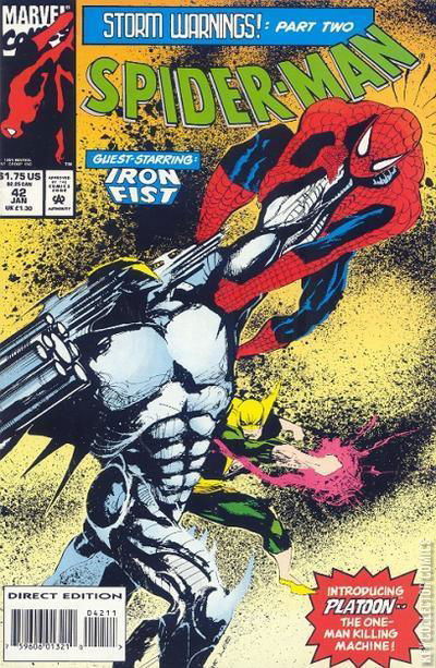 LOCK AND LOAD Spider-Man and Iron Fist has discovered who the mole within the Rand Corporation has been dealing with the terrorist organization known as ARMS. It is David Chodosh who has built himself a cybernetic suit of armor to fight off the pair as Platoon. Although Platoon has superior fire-power over his foes and wants to eliminate them immediately, his puppet masters at ARMS want him to continue the fight to get maximum media attention so they can present the performance of their new armor to potential customers. Not liking this, Platoon tells his superiors that he quits and flees the scene. At the ARMS headquarters, the board of directors wonders how to handle the situation. While the head of the board doesn't find the involvement of Iron Fist and Spider-Man to be an ideal situation, but he tells his colleagues that they must make the best of the situation. By this point, Iron Fist uses his chi to free himself and Spider-Man from the rubble. However, this is too late to stop the ceiling from caving in on them. However, they ultimately get free thanks to Spider-Man's superior strength. Once they are free, they discover that Chodosh had fled the scene. As Spider-Man web-slings after their foe, Iron Fist follows behind on a motorcycle. Platoon's trail leads them to the Brooklyn Bridge, where he has taken a number of hostages. He is furious that the authorities have penned him in on the bridge before he could flee the country and sell his armor to the highest bidder. When Platoon threatens to throw one of the hostages off the building, this reminds Spider-Man of his Uncle Ben and his parents. Spider-Man swings out over the bridge, she catches the man before he hits the waters below. Platoon then begins turning his attention to the heroes, intent on killing them. This battle is captured on live television, much to the delight of ARMS head of the board. While Spider-Man gets the rest of the hostages to safety, Iron Fist keeps Platoon occupied. After the last of the hostages are free, Spider-Man saves Iron Fist when Platoon knocks him off the edge of the bridge. They then duck to safety when Platoon tries to rain acid down on them. They then swing up the other side of the bridge. They damage Platoon's armor, shorting out his weapons systems. Unfortunately, when they try to apprehend their foe, Platoon leaps into the water below. Before they can go after him, Spider-Man's spider-sense goes off warning him of danger below. As they look down, they see the authorities and the press being as they are attacked by more cyborgs.