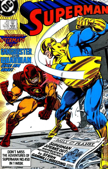 Invasion: Aftermath! "Of Course, you Know, this Means War!" Part 1 of 2. Guest-starring Gangbuster and the Guardian. Story by Roger Stern. Art by Kerry Gammill and Brett Breeding. One is a fully deputized officer of the law. The other is a tough as nails take the law into his own hands vigilante. Can't imagine why these two can't get along. It's Gangbuster vs. the Guardian in a no holds barred thriller! Story continues in Adventures of Superman (1939-2006) #450. Invasion crossover. Story continued from INVASION (DC, 1989 series) #2.