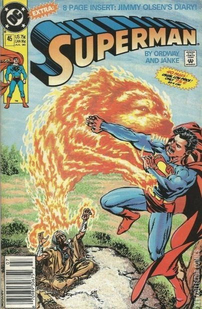 "Native Sons!" Story by Jerry Ordway. Art by Jerry Ordway and Dennis Janke. A Native American shaman has makes his way to Smallville seeking to halt the spread of pollution by the Industrial Nation. Plus, Superman reveals to Lana Lang that he and Lois Lane have begun a romantic relationship. She does not take the news very well. Includes the 8-page insert "Jimmy Olsen's Diary."