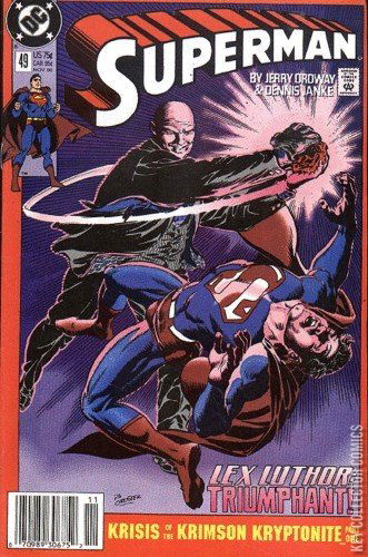 Krisis of the Krimson Kryptonite. Part 1 of 4. "Lex Luthor: Triumphant!" Story by Jerry Ordway. Art by Jerry Ordway and Dennis Janke. Lex Luthor is dying, but he won't allow that to happen until he's destroyed the Man of Steel once and for all. Enter: Mr. Mxyzptlk and Red Kryptonite. Using this mysterious ruby colored rock, Luthor makes Superman his physical equal. Now, let the best man win. Story continues in Adventures of Superman (1939-2006) #472.