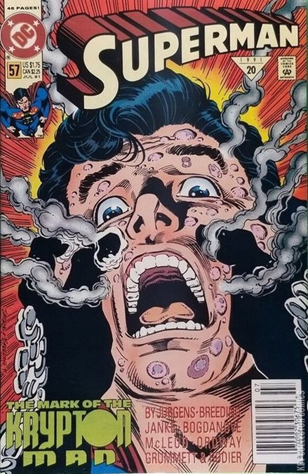 The Mark of the Krypton Man! Part 1 of 3. Featuring the 1st appearance of the Eradicator (in anthropoid form). Story by Dan Jurgens. Art by Dan Jurgens, Art Thibert, Jon Bogdanove, Bob McLeod, Tom Grummett, Brett Breeding, Dennis Janke, Denis Rodier, and Jerry Ordway. A powerful being with ties to Superman's past decides that the Last Son of Krypton is not living up to his heritage, and decides to recreate a dead world here on Earth. Story continues in Adventures of Superman (1939-2006) #480. Story continued from Superman: The Man of Steel (DC, 1991 series) #1 1991 Triangle #20.